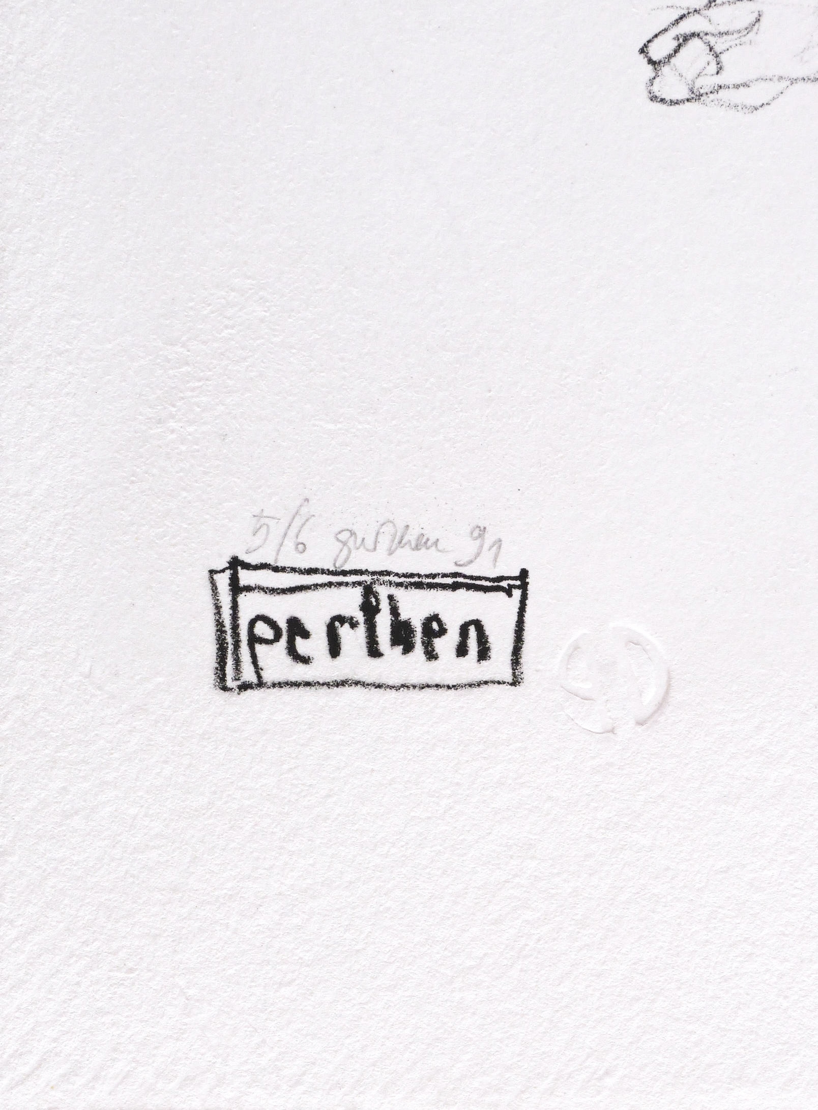 Rechts unten in Bleistift signiert und datiert: ″perthen 91″. Links daneben Auflagenbezeichnung: ″5/6″. Dazu Trockenstempel der Druckpresse. Im Stein links unten weitere Signatur: ″perthen″. – Ohne Mangel. Sehr guter Zustand.