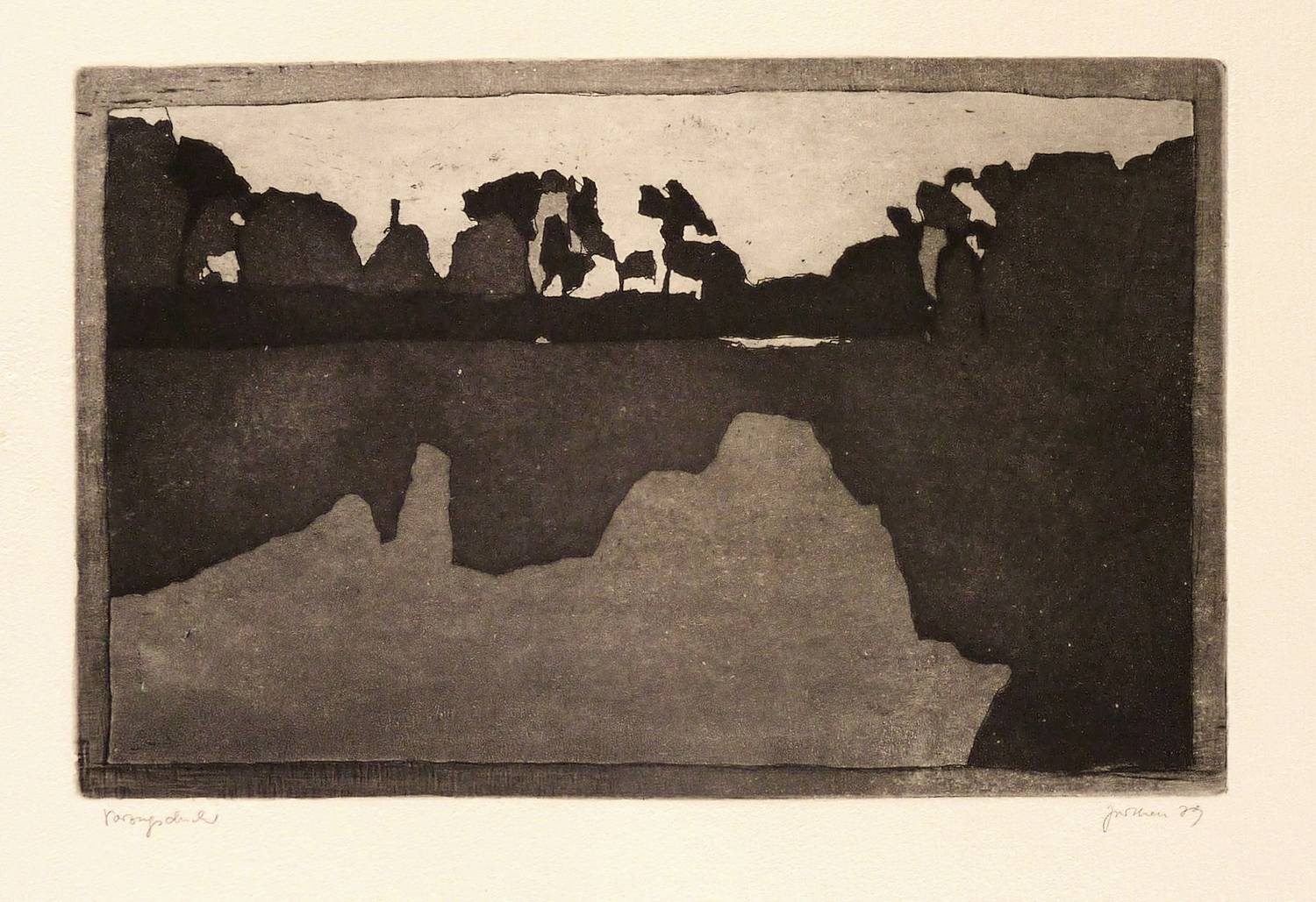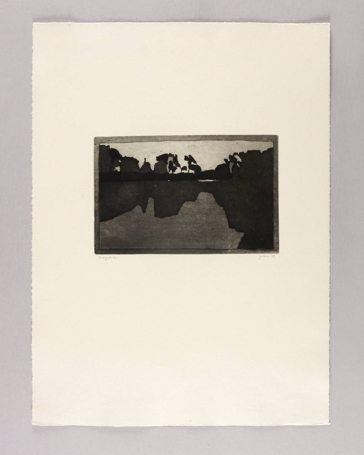 Degen C.2. Perthen. – Aus: Christine Perthen, Sieben Märkische Abendlandschaften. Zu einem Vers von Johannes Bobrowski (Berlin 1979). – Rechts unten in Bleistift signiert und datiert: ″Perthen 79″. Links eigenhändige Auflagenbezeichnung: ″Vorzugsdruck″. Wasserzeichen der Hahnemühle. – Blatt Nr. 4 aus dem Aquatinta-Zyklus ″Sieben Märkische Abendlandschaften (zu einem Vers von Johannes Bobrowski)″ von 1979 (Verzeichnis: Andreas Degen, Johannes- Bobrowski-Bibliografie, Abt. C.2). – Ohne Mängel. Sehr guter Zustand.