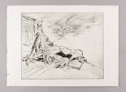 Aus: Christine Perthen, Tagträume - Nachtträume (Berlin: [1983]). – Rechts unten in Bleistift signiert und datiert: ″perthen 82″. Links Auflagenbezeichnung: ″15/15″. Verso nummeriert: ″3″. – Wohl Blatt Nr. 3 aus der für das Oeuvre der Künstlerin zentralen Radier-Folge ″Tagträume - Nachtträume″. – Sehr guter Zustand.