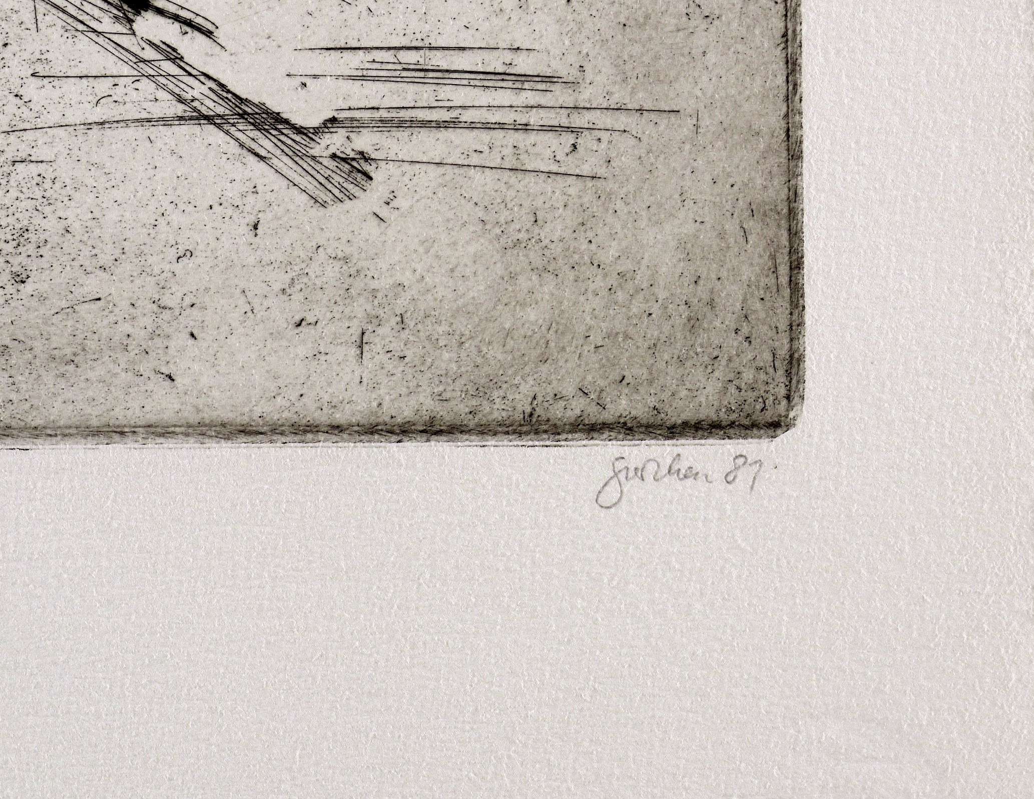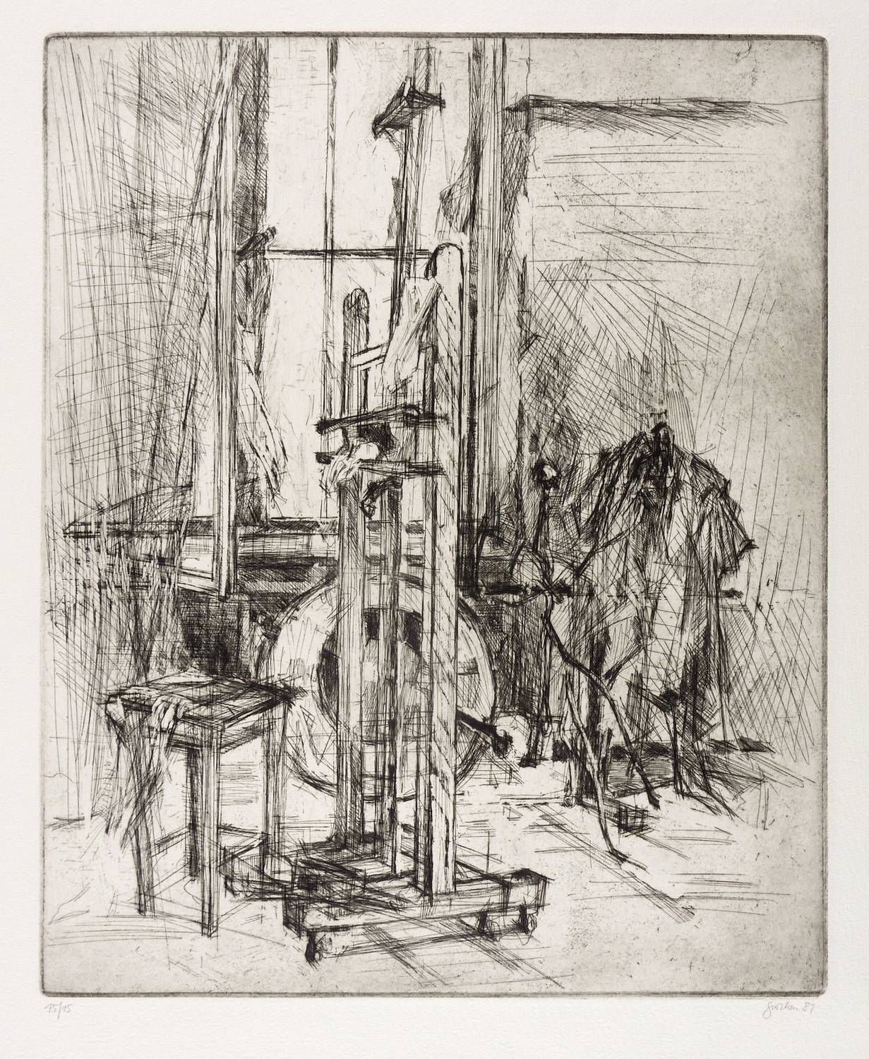 Aus: Christine Perthen, Tagträume - Nachtträume (Berlin: [1983]). – Rechts unten in Bleistift signiert und datiert: ″perthen 81″. Links Auflagenbezeichnung: ″15/15″. Verso nummeriert: ″5″. Wasserzeichen der Hahnemühle. – Wohl Blatt Nr. 5 aus der für das Oeuvre der Künstlerin zentralen Radier-Folge ″Tagträume - Nachtträume″. – Sehr guter Zustand.