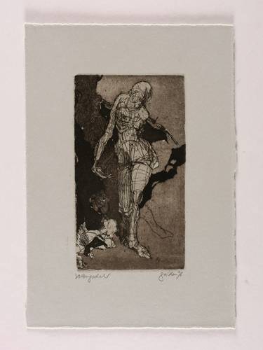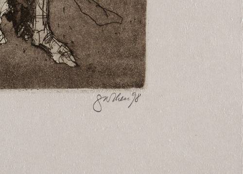 1998. Radierung / Aquatinta & Strichätzung, in Dunkelbraun, auf hellgrau getöntem Velinkarton. – Originale Künstlergrafik, von Christine Perthen. – Vorzugsdruck. – 18,0 x 10,2 cm (Darstellung / Platte), 28 x 20 cm (Blatt).