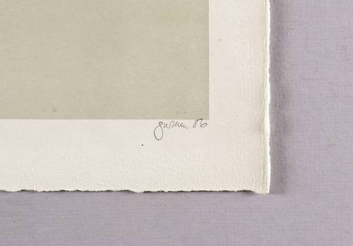 1986. Tonlithografie / Kreide- & Pinsellithografie, in Schwarz, über graugrüner Tonplatte, auf hellchamois Velin. – Originale Künstlergrafik, von Christine Perthen. – Probedruck. – 61,0 x 42,3 cm (Darstellung / Tonplatte), 67 x 48 cm (Blatt).