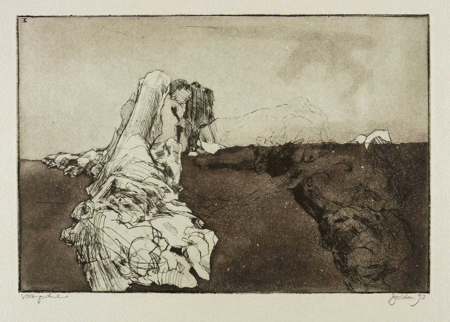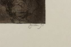 1992/1993. Radierung / Aquatinta & Strichätzung, in Schwarzbraun, auf hellgrau getöntem Velinkarton. – Originale Künstlergrafik, von Christine Perthen. – Vorzugsdruck. – 20,0 x 29,7 cm (Darstellung / Platte), 38 x 44 cm (Blatt).