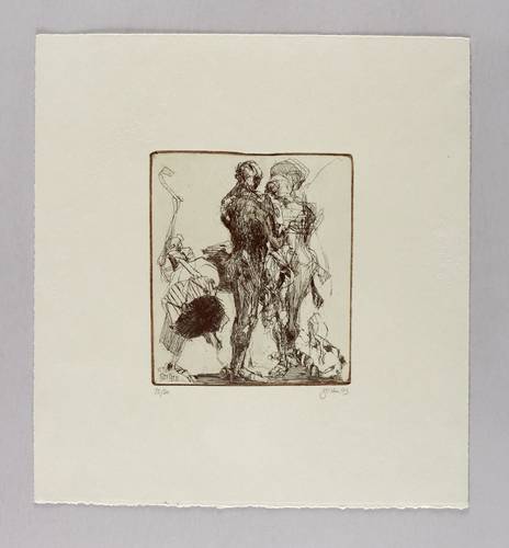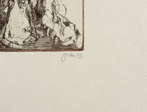 1993. Radierung / Strichätzung & Vernis mou, in Schwarzbraun, auf hellgrau getöntem Velinkarton. – Originale Künstlergrafik, von Christine Perthen. – Auflage Exemplar Nr. 15/20. – 19,9 x 17,2 cm (Darstellung / Platte), 40 x 37 cm (Blatt).