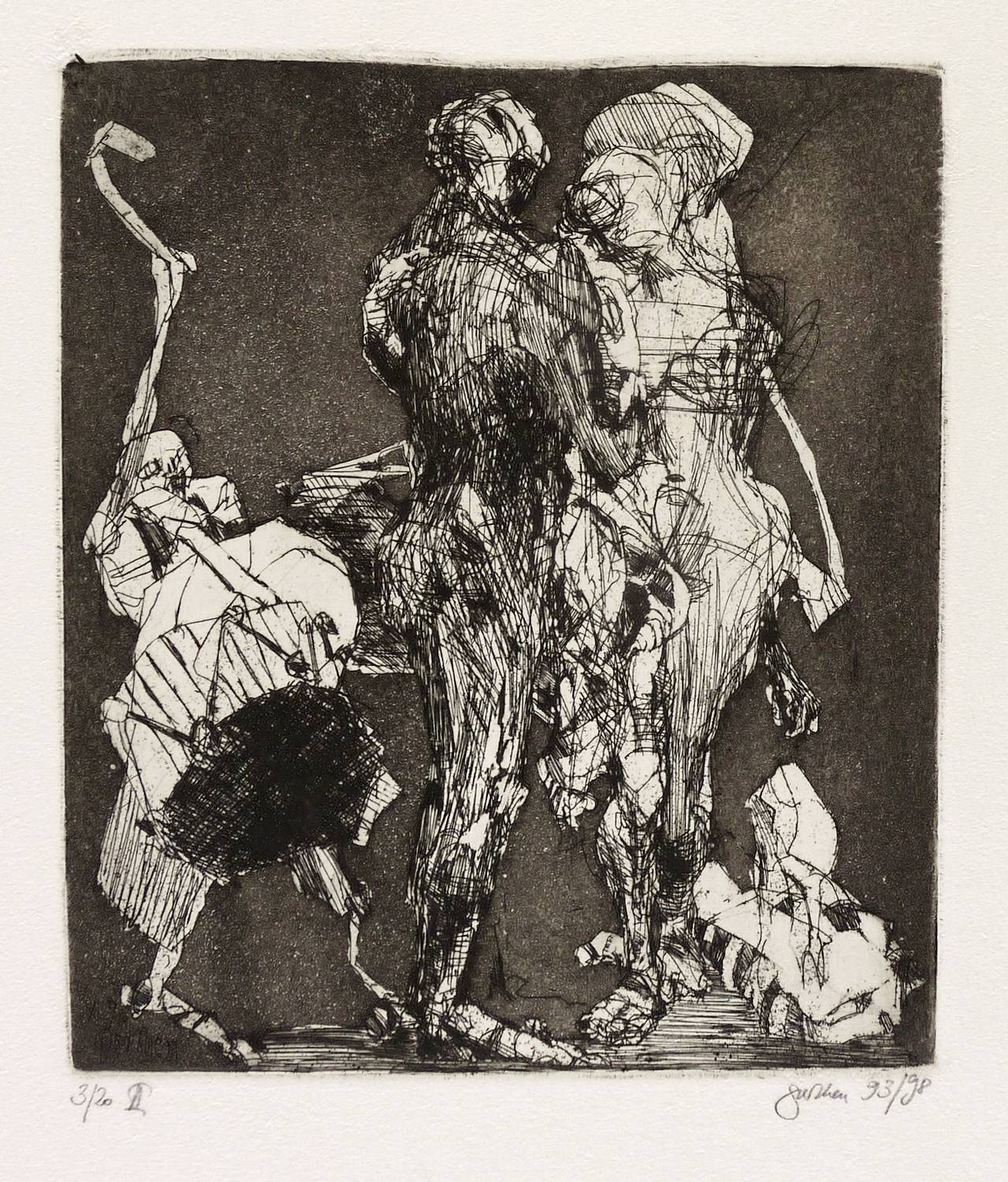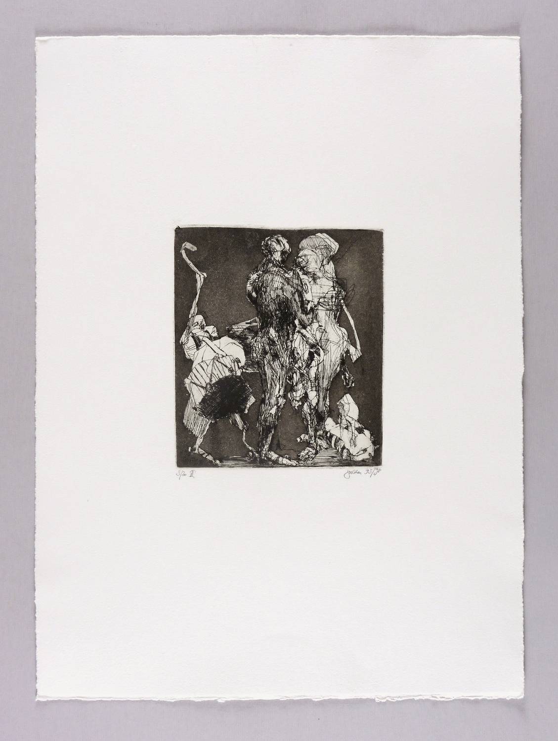 Rechts unten in Bleistift signiert und datiert: ″perthen 93/98″. Links Auflagenbezeichnung: ″3/20 II″. In der Platte links untenSignatur und Jahr: ″c. perthen XI. 93″. – Späterer Zustand der Radierung ″Liebespaar mit Trommler (II)″ von 1993, hier mit Aquatinta als Fond der Figuration. – Sehr guter Zustand.