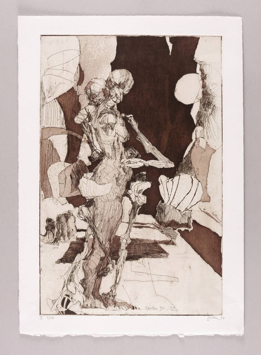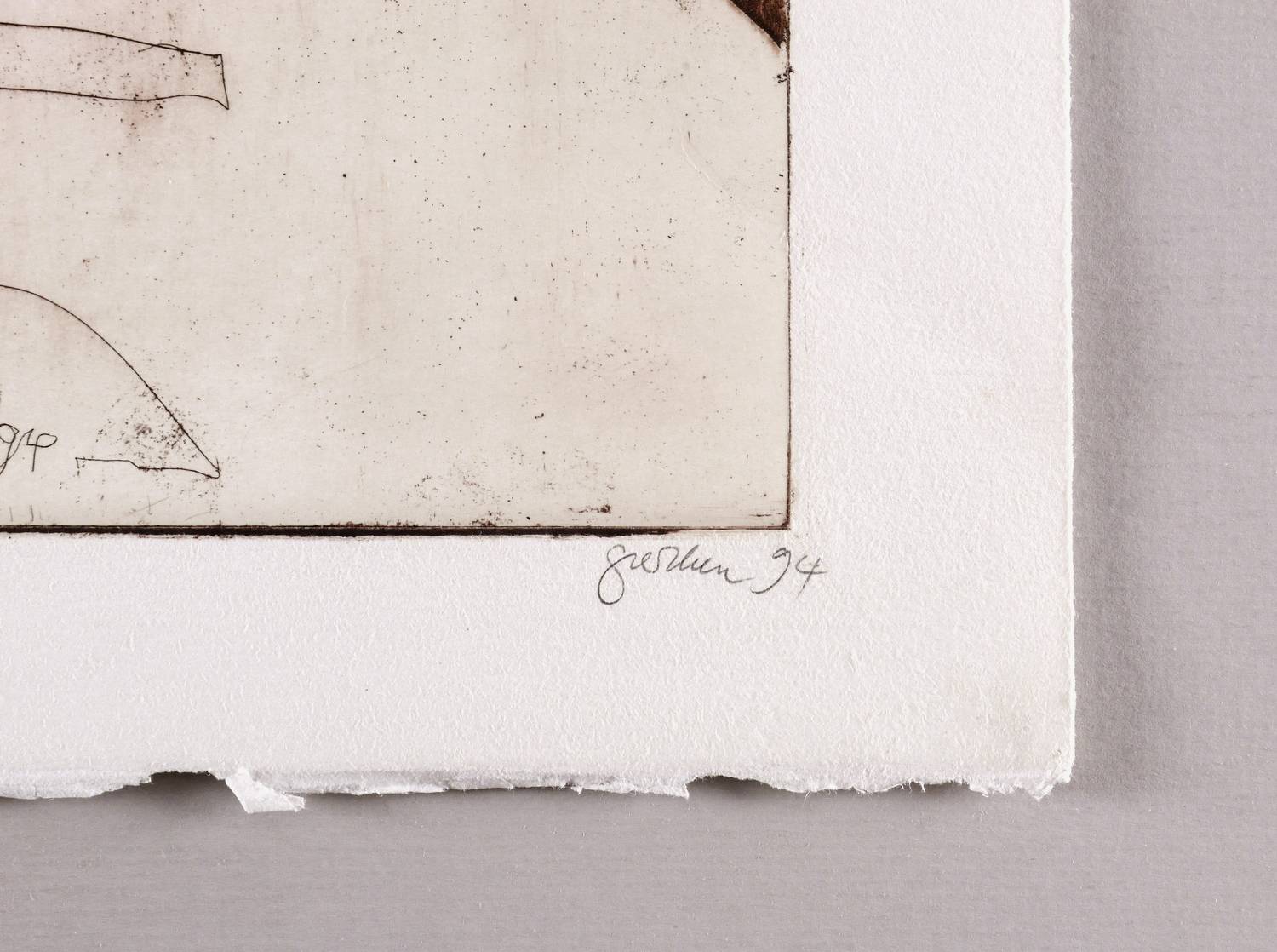 Rechts unten in Bleistift signiert und datiert: ″perthen 94″. Links Auflagenbezeichnung: ″II 3/20″. Verso Titel und Signatur: ″vor dunkler wand / perthen″. Dazu Widmung der Künstlerin. In der Platte unten nochmals Signatur und Jahr: ″perthen 94″. – Stehender Frauenakt im Profil, abgewandt und vom Tod umschlungen. – Sehr guter Zustand.
