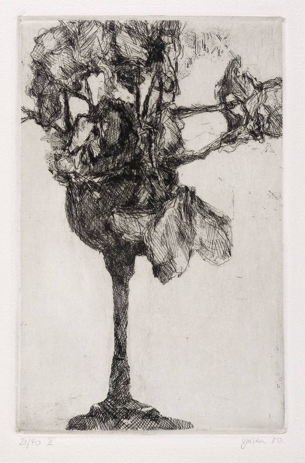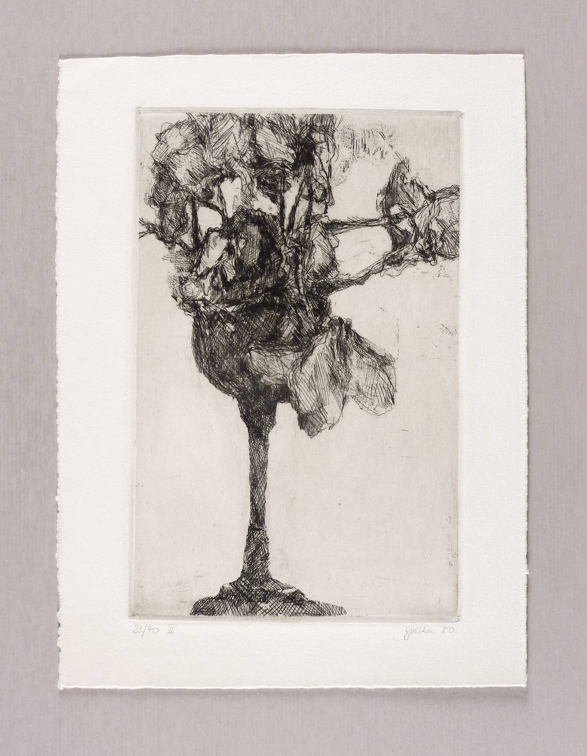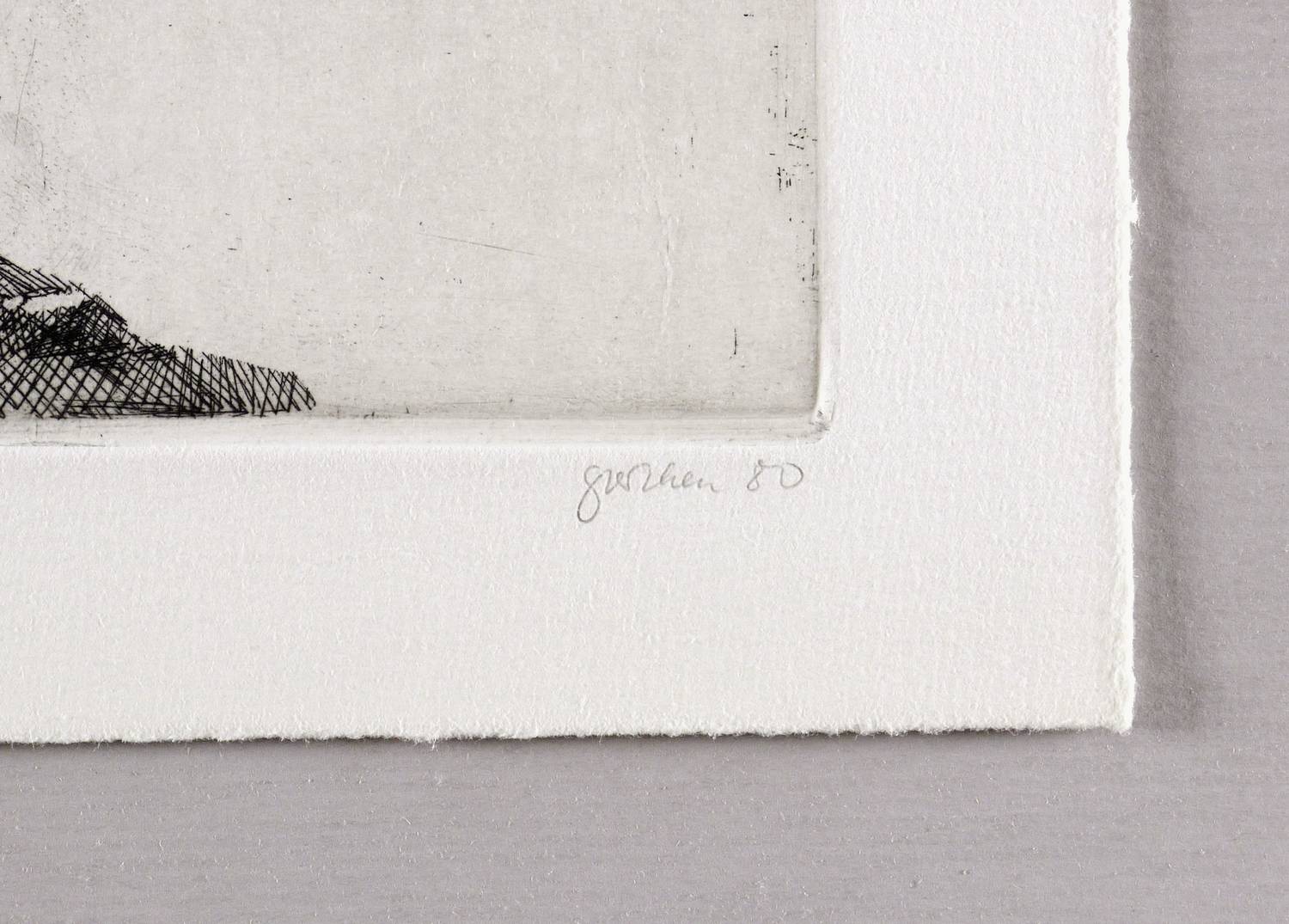 1980. Radierung / Strichätzung & Vernis mou, in Schwarz, auf kräftigem hellchamois Velin. – Originale Künstlergrafik, von Christine Perthen. – Auflage Exemplar Nr. 33/40. – 21,4 x 13,7 cm (Darstellung / Platte), 27 x 20 cm (Blatt).