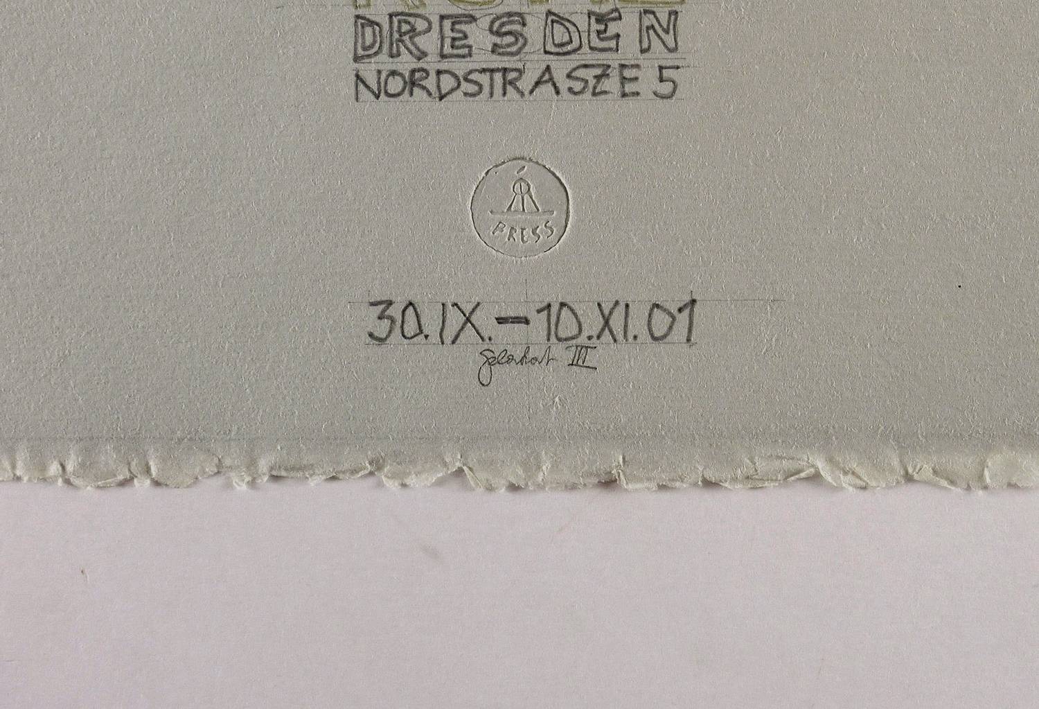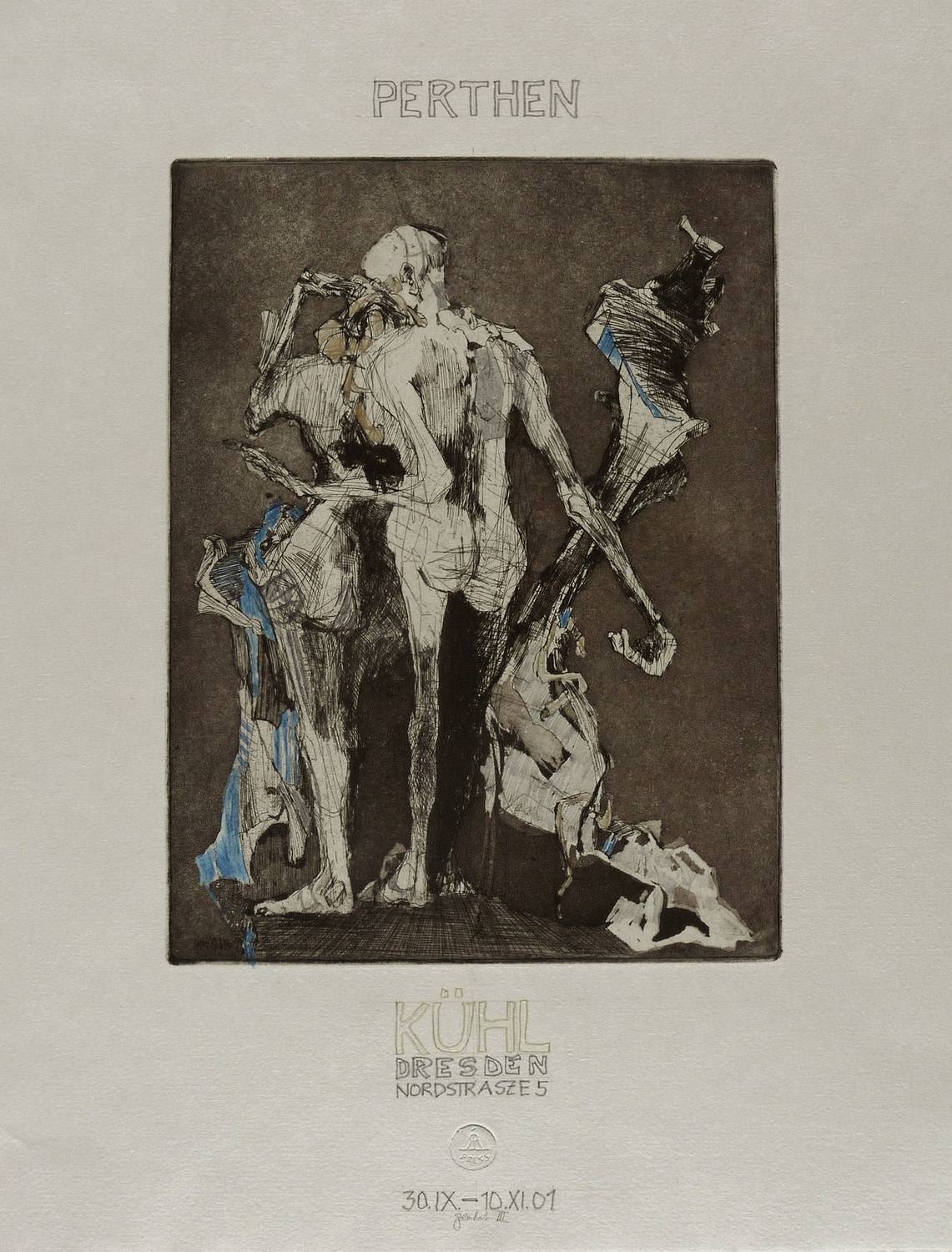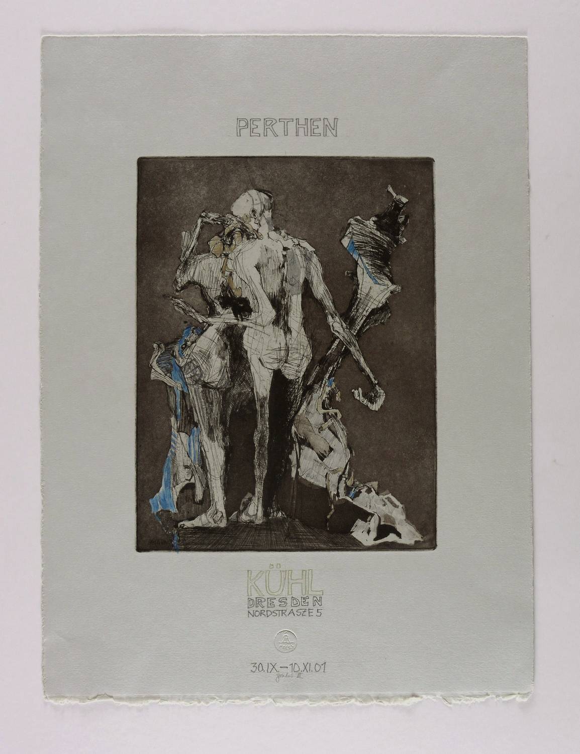 Nicht handsigniert. Inschriften in Bleistift. Dazu unterhalb bezeichnet: ″plakat III″. Trockenstempel des Druckers oder der Grafikpresse. – Unikater Entwurf für ein Ausstellungsplakat zur Ausstellung von Christine Perthen in der Galerie Kunstausstellung Kühl in Dresden 30.9.-10.11.2001. – Überarbeitung einer Radierung von 1993. – Sehr guter Zustand.