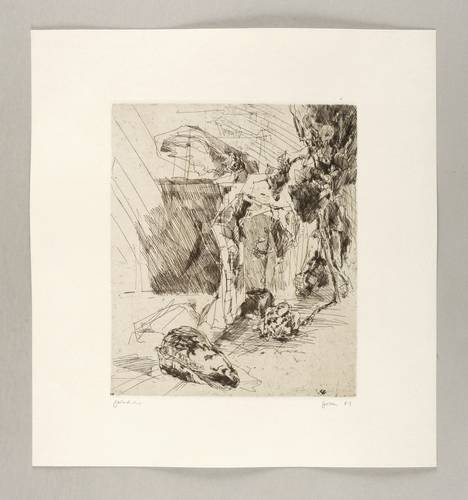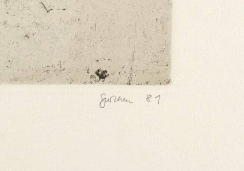 1981. Radierung / Strichätzung, in Schwarzbraun, mit Plattenton, auf hellchamois Velinkarton. – Originale Künstlergrafik, von Christine Perthen. – Probedruck. – 26,4 x 22,0 cm (Darstellung / Platte), 40 x 37 cm (Blatt).