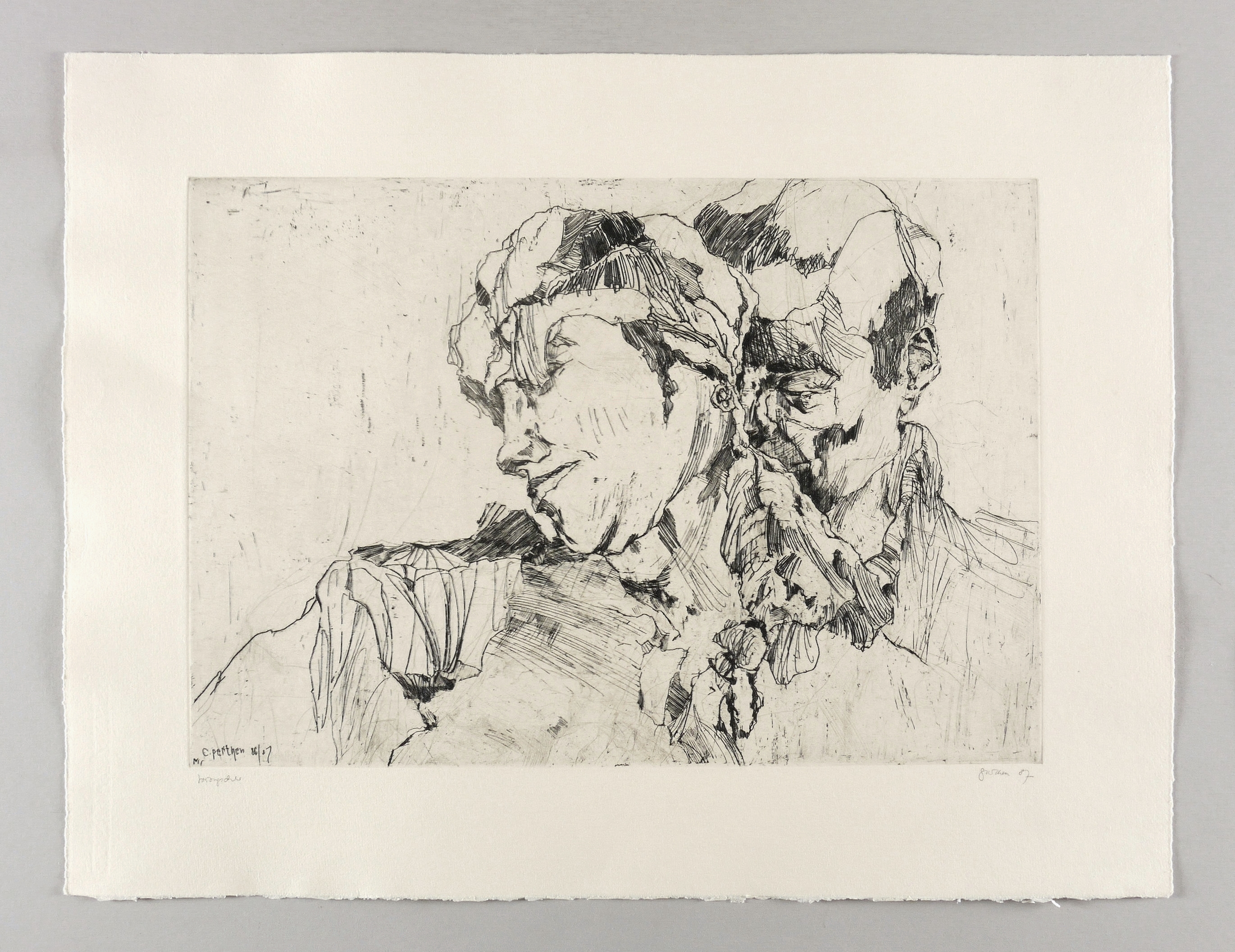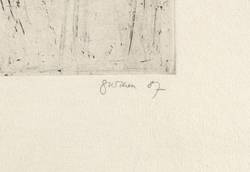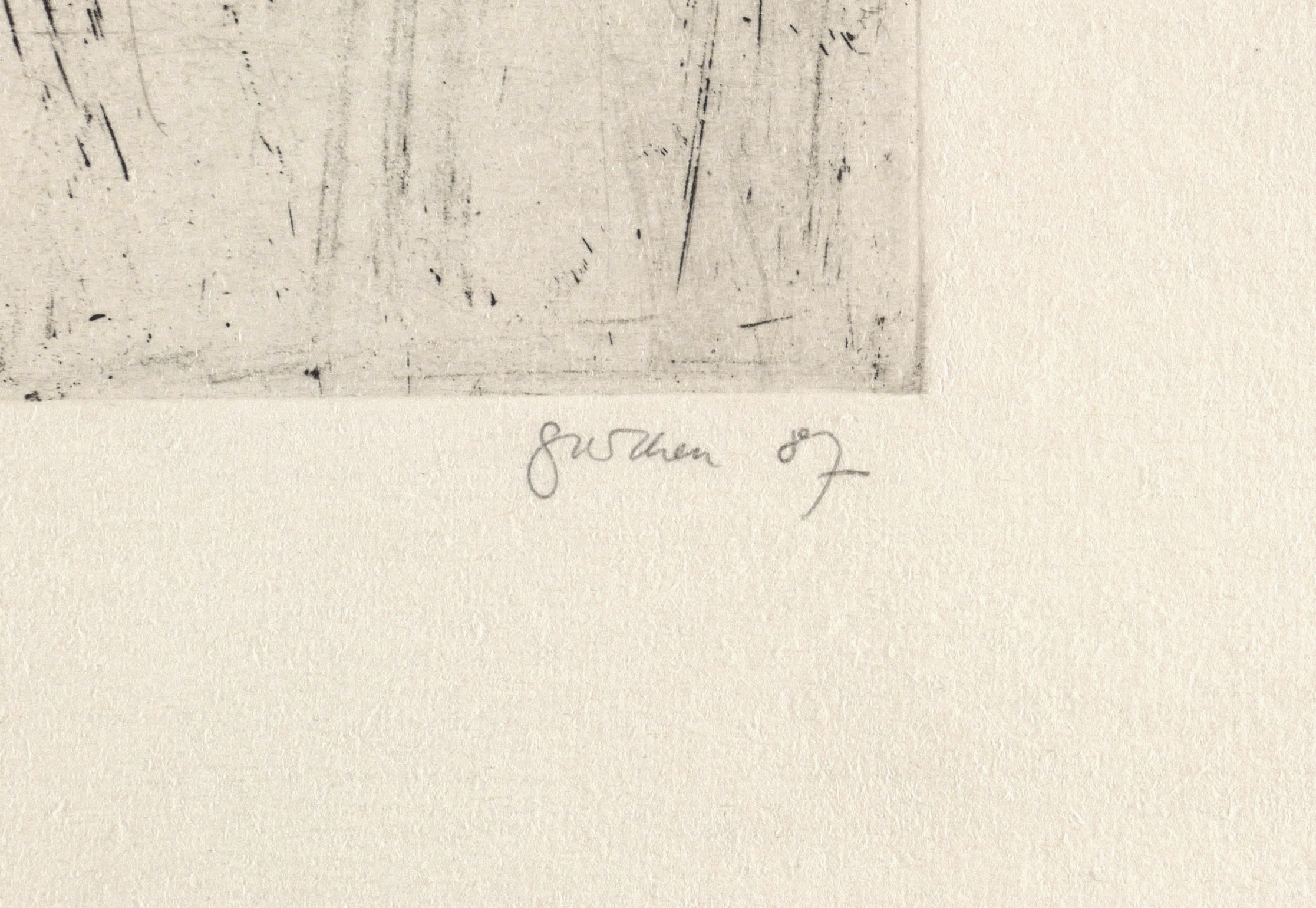 1986/1987. Radierung / Strichätzung & Kaltnadel, mit leichtem Plattenton, in Schwarz, auf chamois Hahnemühle. – Originale Künstlergrafik, von Christine Perthen. – Vorzugsdruck. – 34,5 x 49,7 cm (Darstellung / Platte), 50 x 65 cm (Blatt).