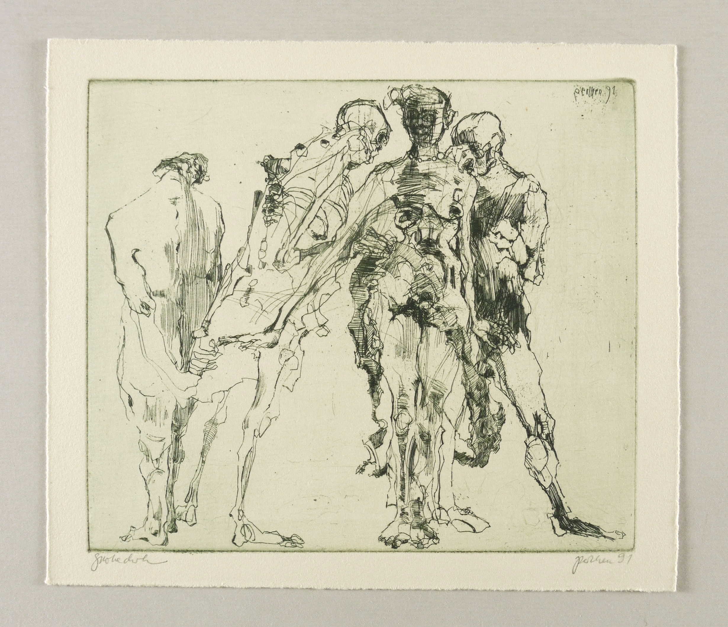 1991. Radierung / Strichätzung & Kaltnadel, in Schwarz, auf hellbeige getöntem Velinkarton. – Originale Künstlergrafik, von Christine Perthen. – Probedruck. – 19,9 x 23,1 cm (Darstellung / Platte), 23 x 27 cm (Blatt).