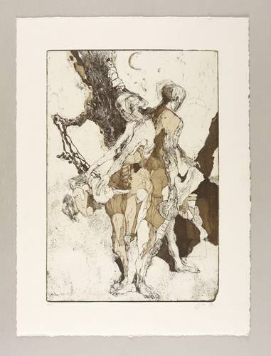 Rechts unten in Bleistift signiert und datiert: ″Perthen 94″. Links Auflagenbezeichnung: ″e.a.″ In der Platte links unten nochmals Signatur und Jahr: ″C. Perthen 94″. Verso Titel: ″MANN UND FRAU VOR DUNKLEM BAUM″. Dazu diverse Ausstellungs-Nr. sowie Widmung der Künstlerin. Wasserzeichen der Hahnmühle. – Sehr guter Zustand.