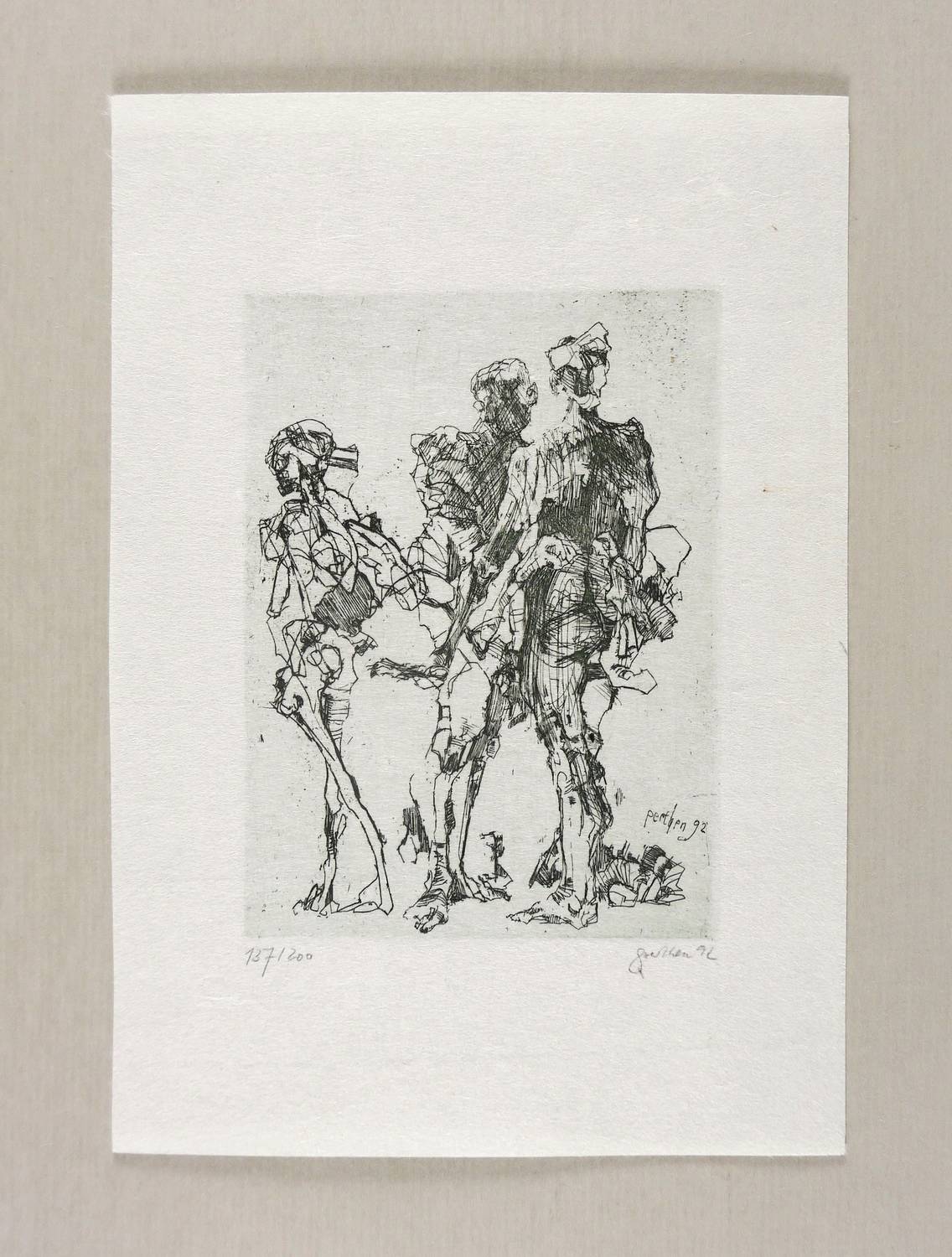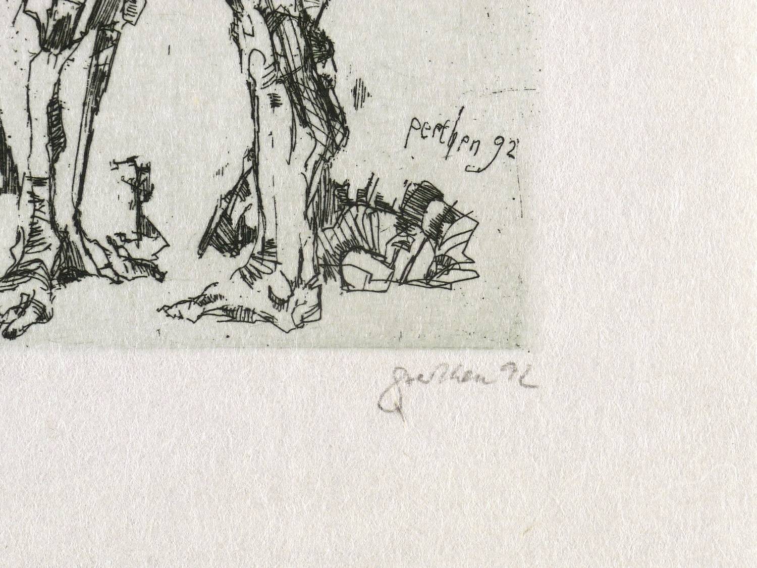 Rechts unten in Bleistift signiert und datiert: ″Perthen 93″. Links Auflagenbezeichnung: ″II 7/12″. Im unteren Blattrand Titel: ″Aufhelfen″. In der Platte links unten nochmals Signatur und Jahr: ″C Perthen 93″. – Sehr guter Zustand.