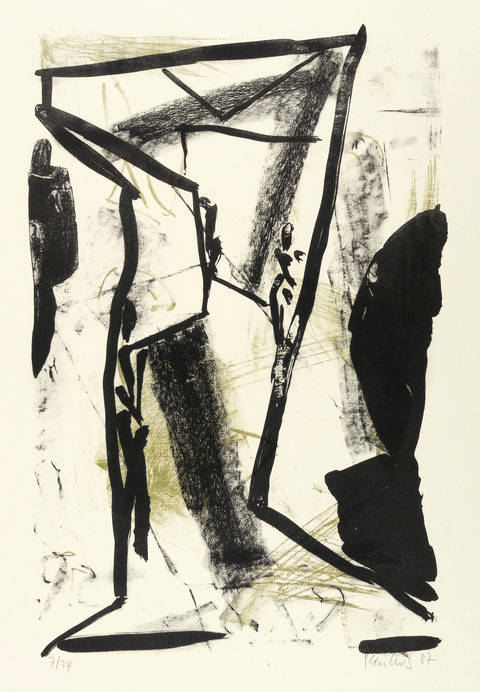 1987. Farblithografie / Kreide- & Pinsellithografie, in Olivgrün & Schwarz, auf gelbem Hahnemühle-Bütten. – Originale Künstlergrafik, von Stefan Plenkers. – Auflage Exemplar Nr. 7/74. – 39,5 x 26,5 cm (Darstellung / Druckbild), 53,5 x 39,5 cm (Blatt).