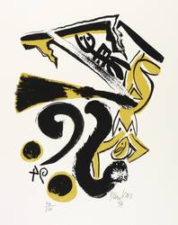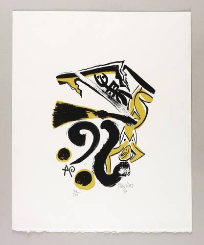 1994. Farbsiebdruck / Farbserigrafie, in Ocker & Schwarz, auf festem hellem Velin. – Originale Künstlergrafik, von Stefan Plenkers. – Auflage Exemplar Nr. 40/200. – 30,5 x 24,3 cm (Darstellung / Druckbild), 52 x 43 cm (Blatt).