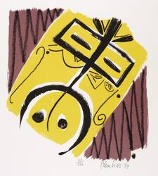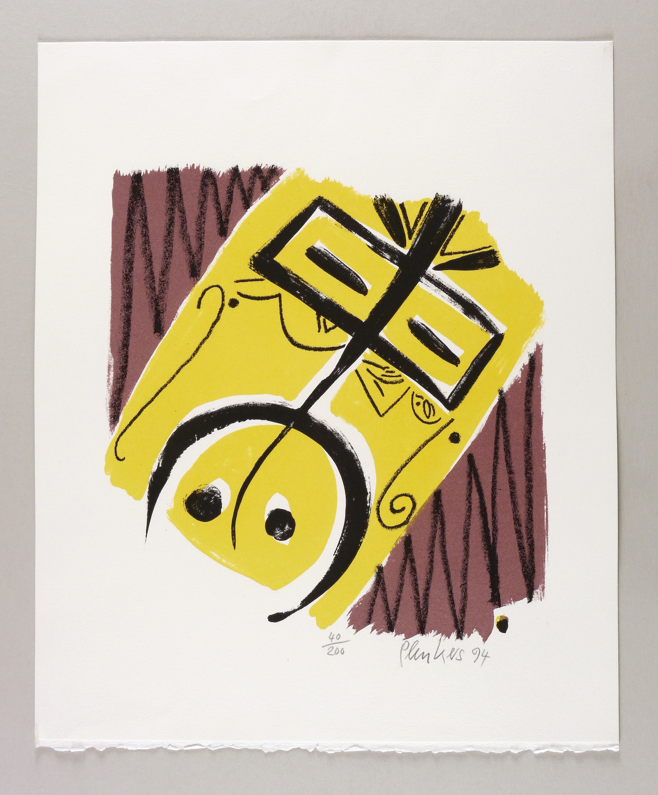 1994. Farbsiebdruck / Farbserigrafie, in Ocker, Braunviolett & Schwarz, auf festem hellem Velin. – Originale Künstlergrafik, von Stefan Plenkers. – Auflage Exemplar Nr. 40/200. – 35,0 x 31,8 cm (Darstellung / Druckbild), 52 x 43 cm (Blatt).