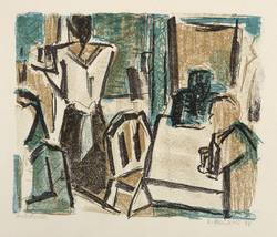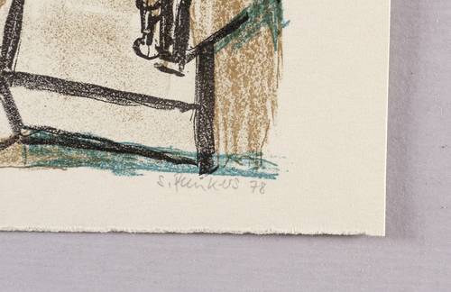 1978. Farblithografie / Kreide- & Pinsellithografie, in 3 Farben, auf glattem hellchamois Velin. – Originale Künstlergrafik, von Stefan Plenkers. – Probedruck. – 15 x 19 cm (Blatt), 11,7 x 14,2 cm (Darstellung / Druckbild).