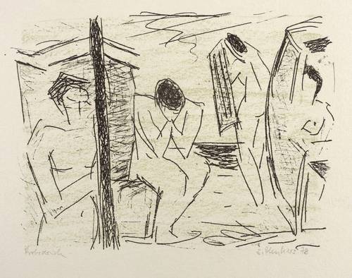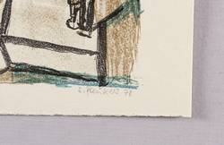 Rechts unten in Bleistift signiert und datiert: ″Plenkers 78″. Links Auflagenbezeichnung: ″Probedruck″. Die Farblithografie verso ebenfalls signiert und datiert: ″S. Plenkers 78″. Dazu wieder bezeichnet: ″Probedruck″. Weiter Neujahrsgruß 1981 an Gerlint und Gert Söder, Dresden. – Auf der Rückseite weitere signierte und datierte Farblithografie ″Badende am Strand″ von 1978 (10,5 x 14,2 cm). – Provenienz: Sammlung Gerlint und Gert Söder, Dresden. – Sehr guter Zustand.