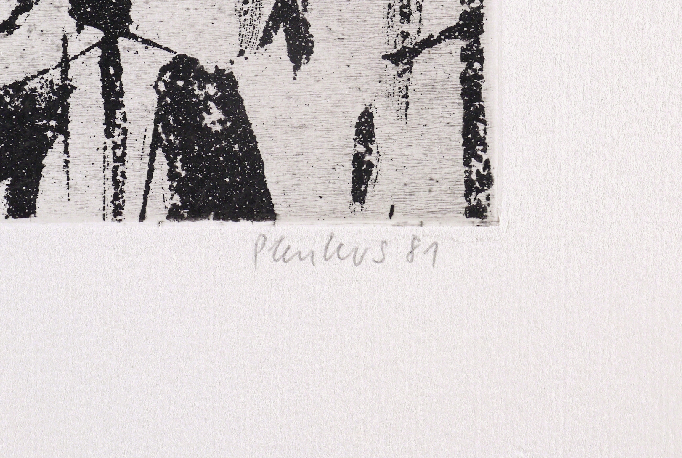 1981. Radierung / Reservage, in Schwarz, auf hartem hellchamois Weißenborn. – Originale Künstlergrafik, von Stefan Plenkers. – Auflage Exemplar Nr. 36/200. – 17,5 x 25,0 cm (Darstellung / Platte), 37 x 35 cm (Blatt).