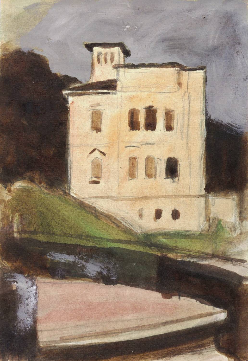 Verso Signatur-Stempel aus dem Künstler-Nachlass: ″Egon Pukall″ – Auf der Rückseite Bleistift-Studie bzw. Skizze zu einem Fensterbild, partiell aquarelliert. – Sehr guter Zustand.