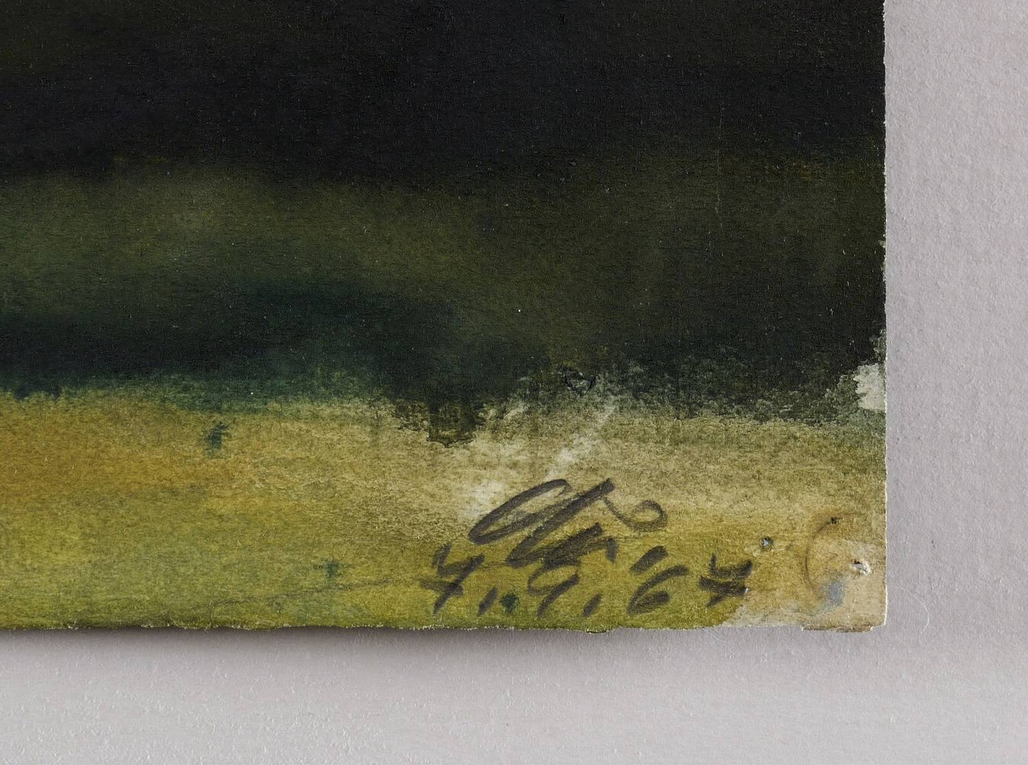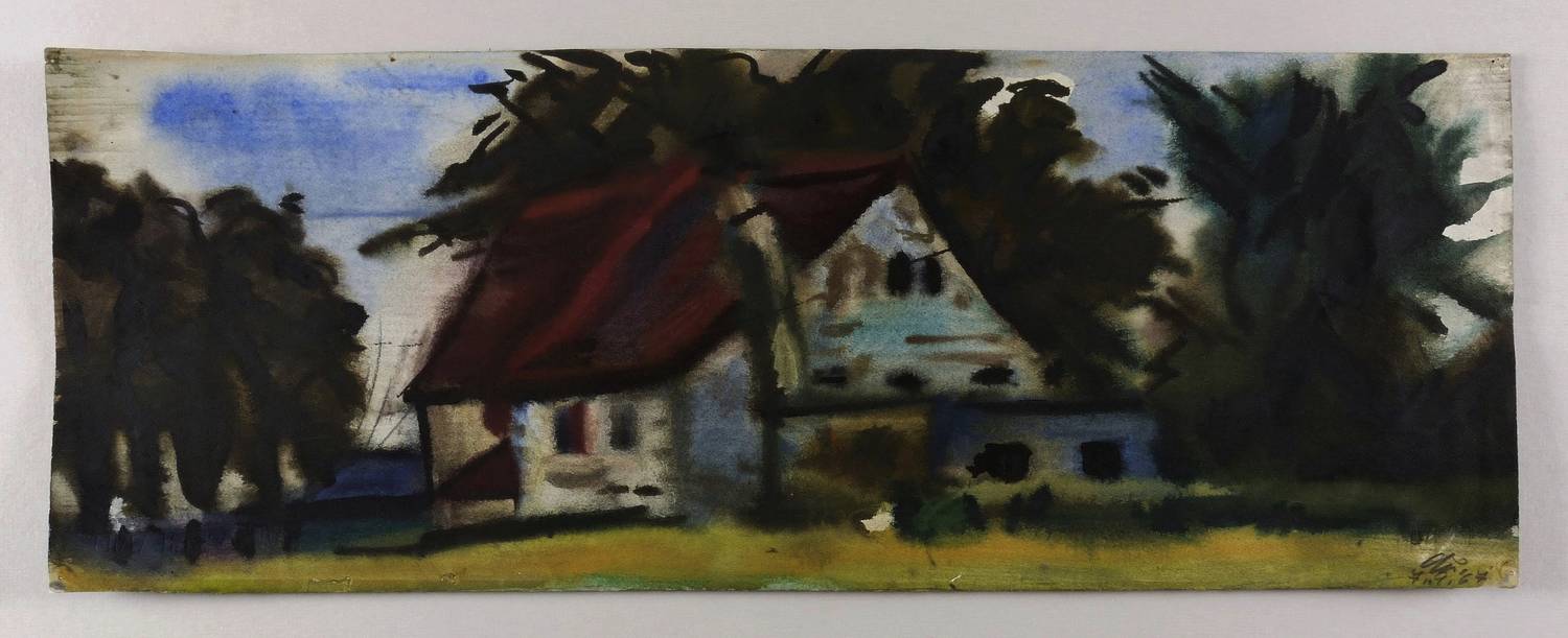 Nicht bei Dittrich. – Rechts unten in Bleistift signiert und datiert: ″Qu. 7.9.67″. Verso eigenhändig bezeichnet: ″Querner Aquarell / Einsames Haus / 1967″. Dazu das eigenhändige Qualitätssigel ″XX″. – In den Ecken originale Reißzwecklöchlein. Blattrücken mit Papierresten der ursprünglichen Montierung des Künstlers. Sehr guter Zustand.