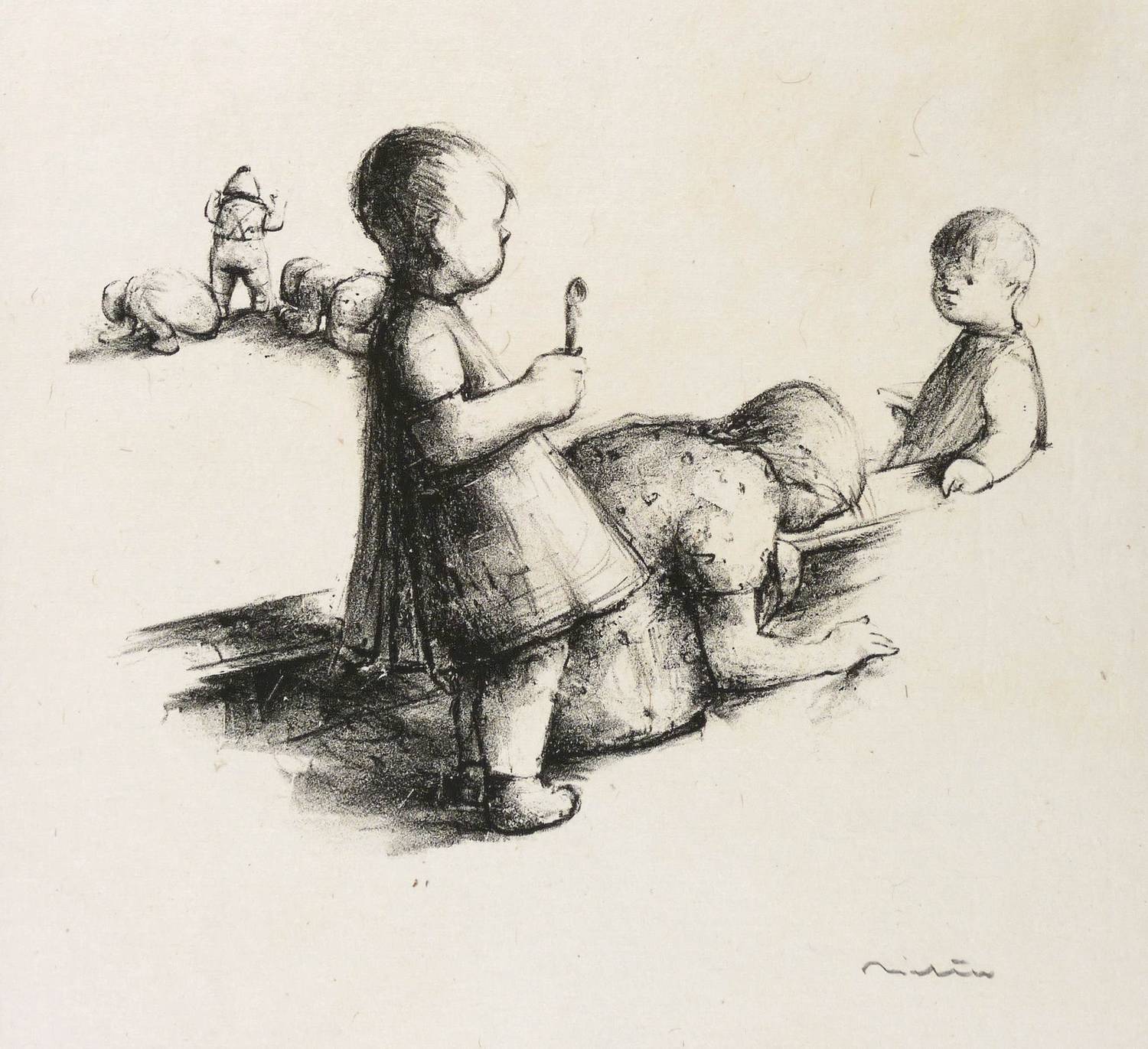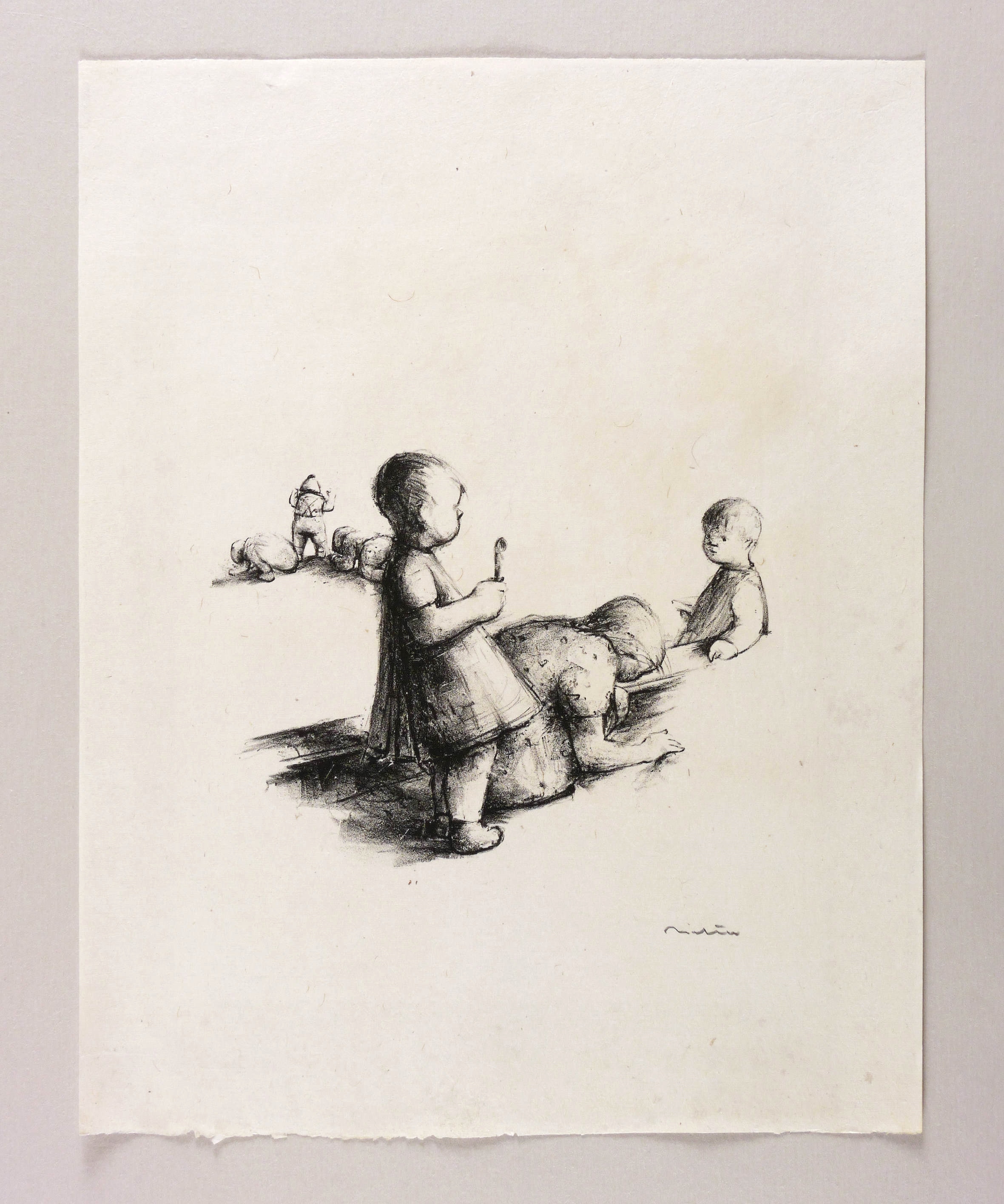 Schmidt 144. – Rechts unten in Bleistift signiert. – Blatt Nr. 6 aus der 7-teiligen Folge ″Kinderspielplatz″, die 1941 im Eigenverlag erschien. - Eines von insgesamt 15 Exemplaren, von denen jeweils 6 auf Japan und auf China abgezogen wurden, 3 als Künstlerexemplare. – Papier mit leichten kaum merklichen altersbedingten Flecken. Insgesamt gut erhalten. Guter Zustand.