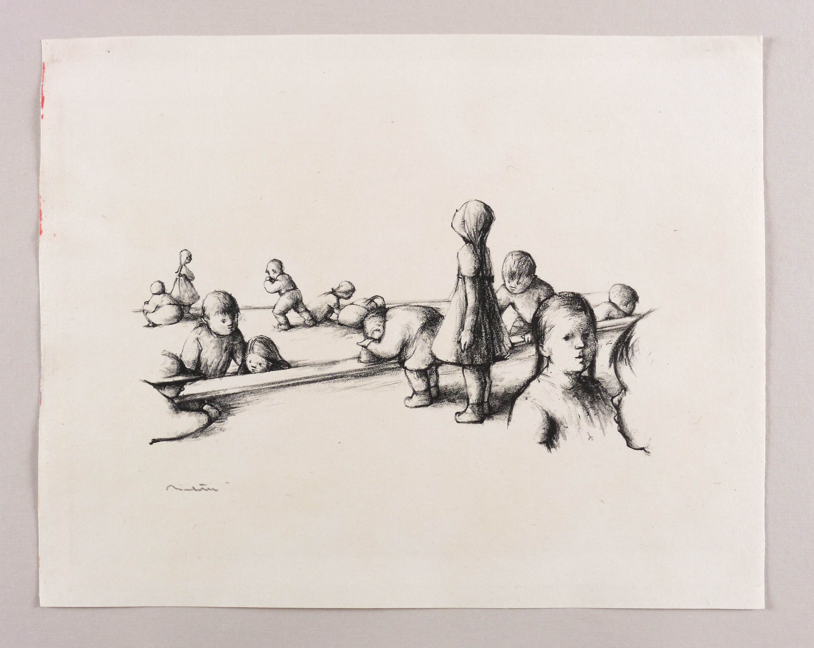 Links unten in Bleistift signiert. – Blatt Nr. 4 aus der 7-teiligen Folge ″Kinderspielplatz″, die 1941 im Eigenverlag erschien. - Eines von insgesamt 15 Exemplaren, von denen jeweils 6 auf Japan und auf China abgezogen wurden, 3 als Künstlerexemplare. – Tadellos erhalten. Sehr guter Zustand.