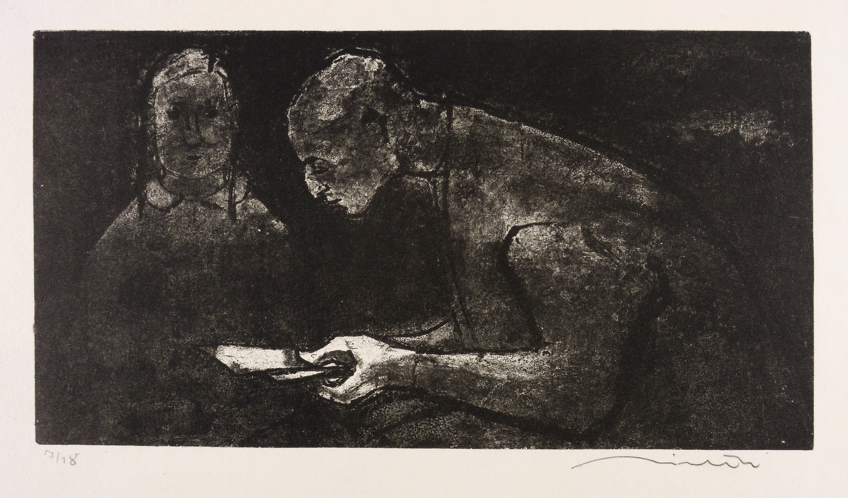 Richter, Hans Theo. – „Vorlesender mit hellem Buch und Mädchen”.