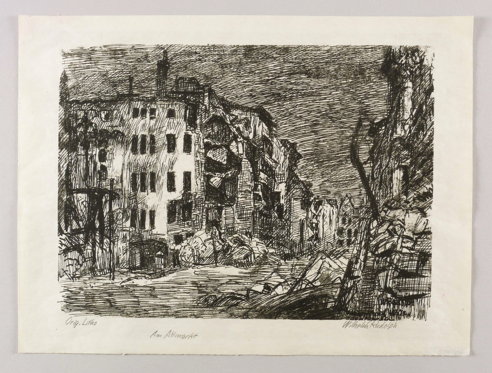Rechts unten in Bleistift signiert: ″Wilhelm Rudolph″. Links bezeichnet: ″Orig. Litho″. Mittig eigenhändiger Titel: ″Am Altmarkt″. Im Stein rechts unten zusätzlich Signatur: ″W. Rudolph″. Verso diverse Notationen. – Druck von Alfred Ehrhardt, Dresden. – Vgl. W.R. Dresden 45, Radebeul: Ausstellung Dresdner Kunst 2018, Abb. S. 136. – Am Blattrücken leichte Montagespuren. Ecke rechts unten etwas ausgedünnt. Insgesamt aber erfreulich gutes Erscheinungsbild. Guter Zustand.