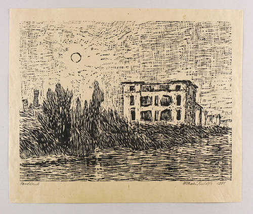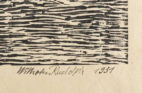 Rechts unten in schwarzer Feder signiert und datiert: ″Wilhelm Rudolph 1951″. Links bezeichnet: ″Handdruck″. – Eigenhändiger Abzug bzw. Abrieb des Künstlers auf eigens getöntem Papier. - Ausstellung: 1982 Galerie Döbele Ravensburg (Ausst.-Kat. Nr. 144). - Literatur: W.R. Dresden 45. Holzschnitte und Federzeichnungen (Leipzig: Reclam 1983), Abb. S. 45. – Leichte Altersspuren, im Rand bisweilen leichte Flecken. Insgesamt guter Zustand.