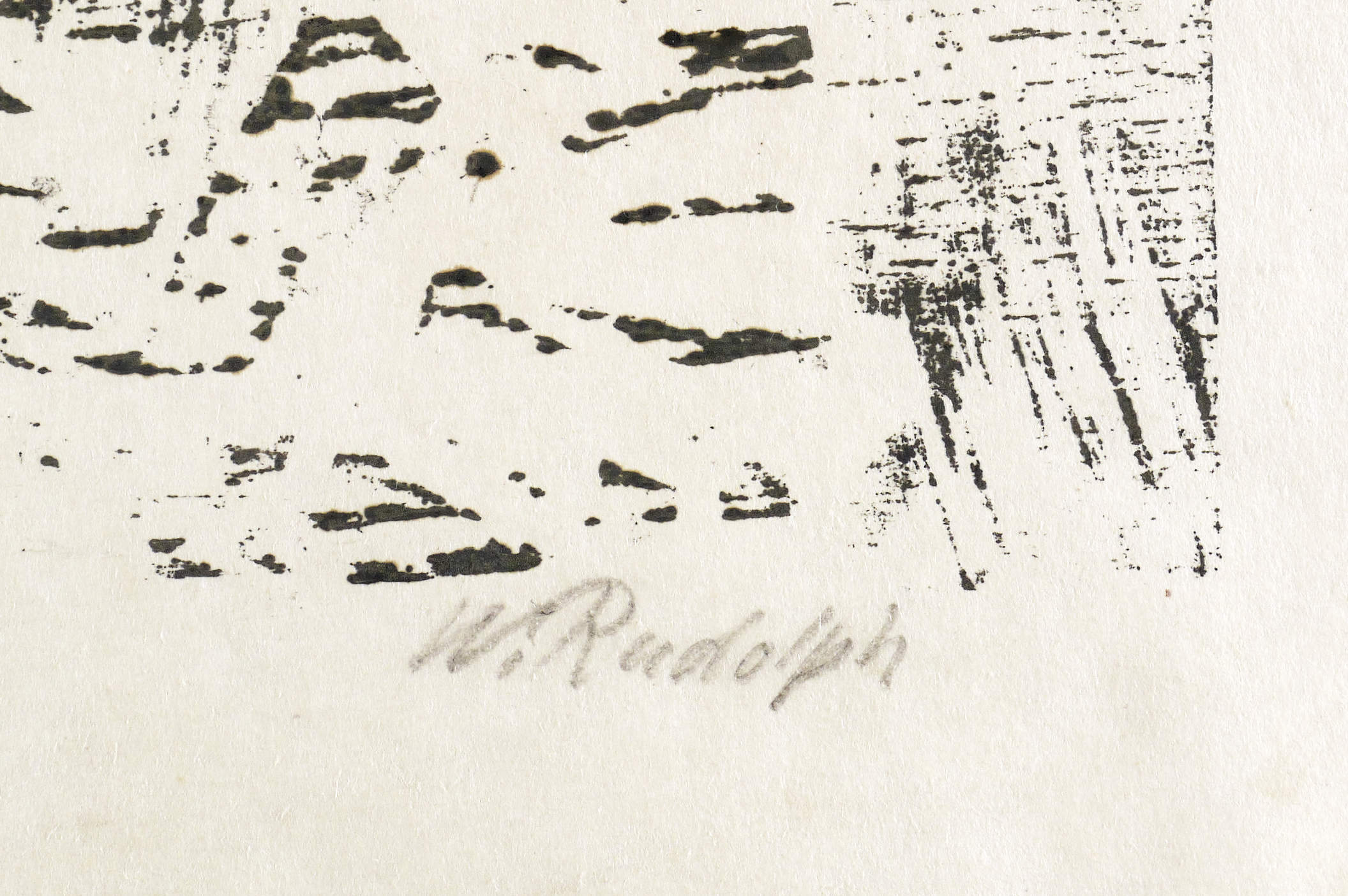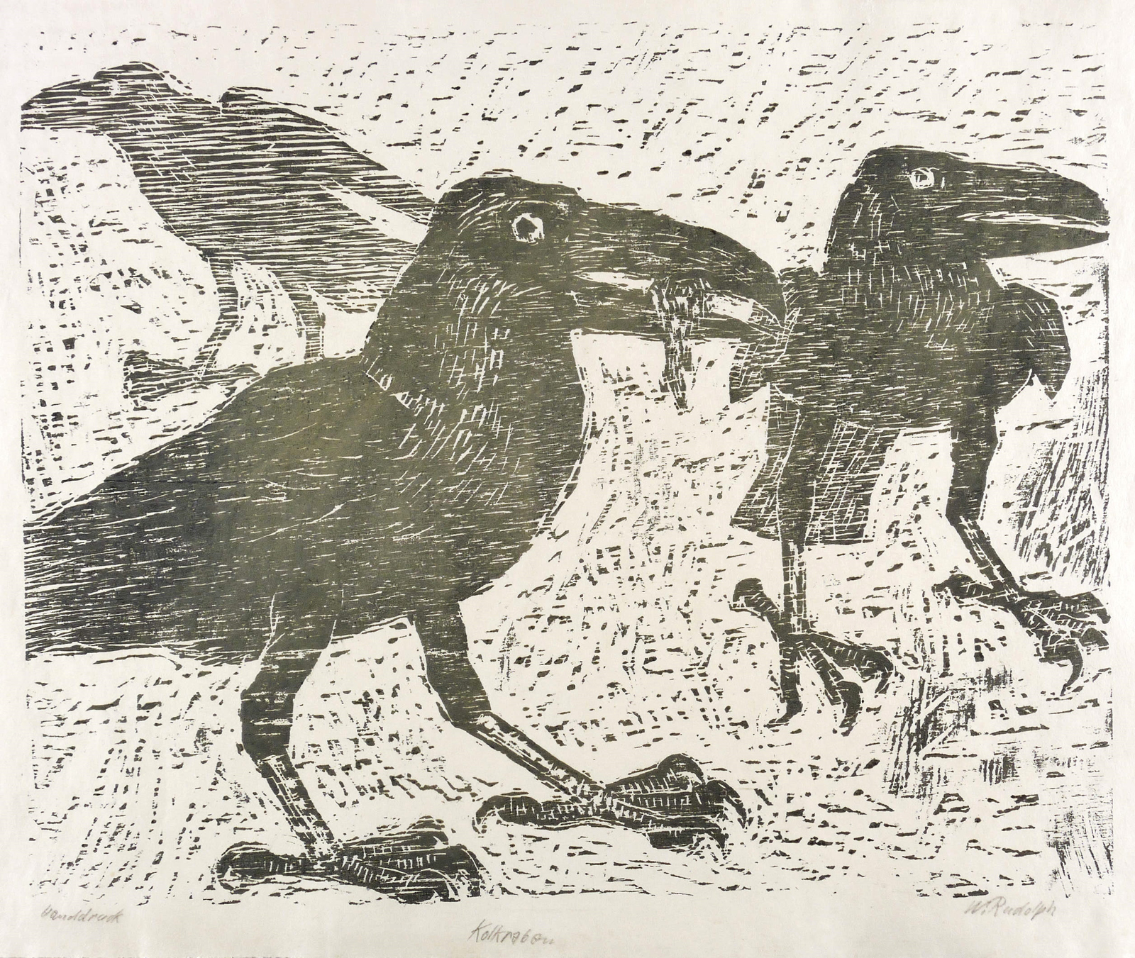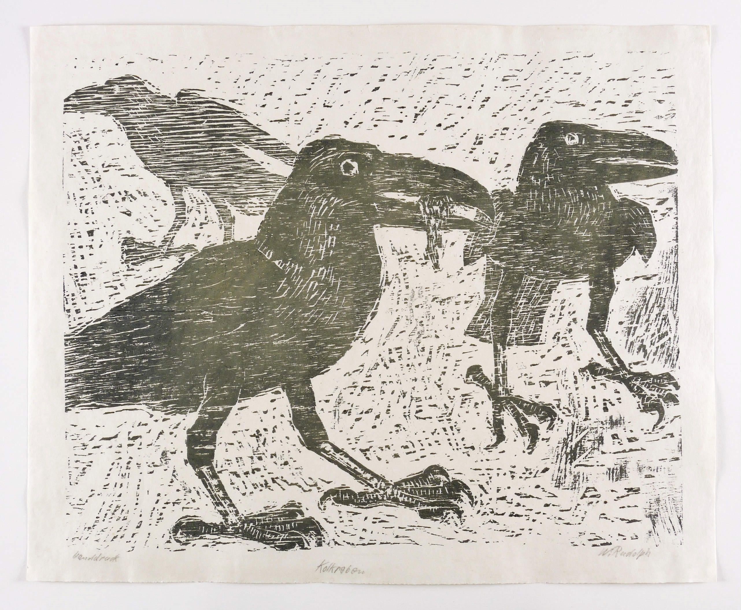Rechts unten in Bleistift signiert: ″W. Rudolph″. Links bezeichnet: ″Handdruck″. Etwas weiter unten mittig Titel: ″Kolkraben″. – Eigenhändiger Abzug bzw. Abrieb des Künstlers. - Ausstellung: 1960 Staatliche Kunstsammlungen Dresden (Ausst.-Kat. Nr. 172), 1976 Staatliche Museen Berlin (Ausst.- Kat. Abb. 57), 1982 Galerie Döbele Ravensburg (Ausst.-Kat. Nr. 123), 1988 Galerie Döbele Ravensburg (Ausst.-Kat. Nr. 69, Abb. 37). - Literatur: W.R. Holzschnitte aus zwei Jahrzehnten (Feldafing: Bucheim Verlag 1958), Abb. – Guter Zustand.