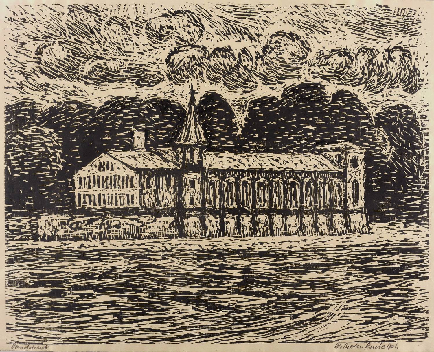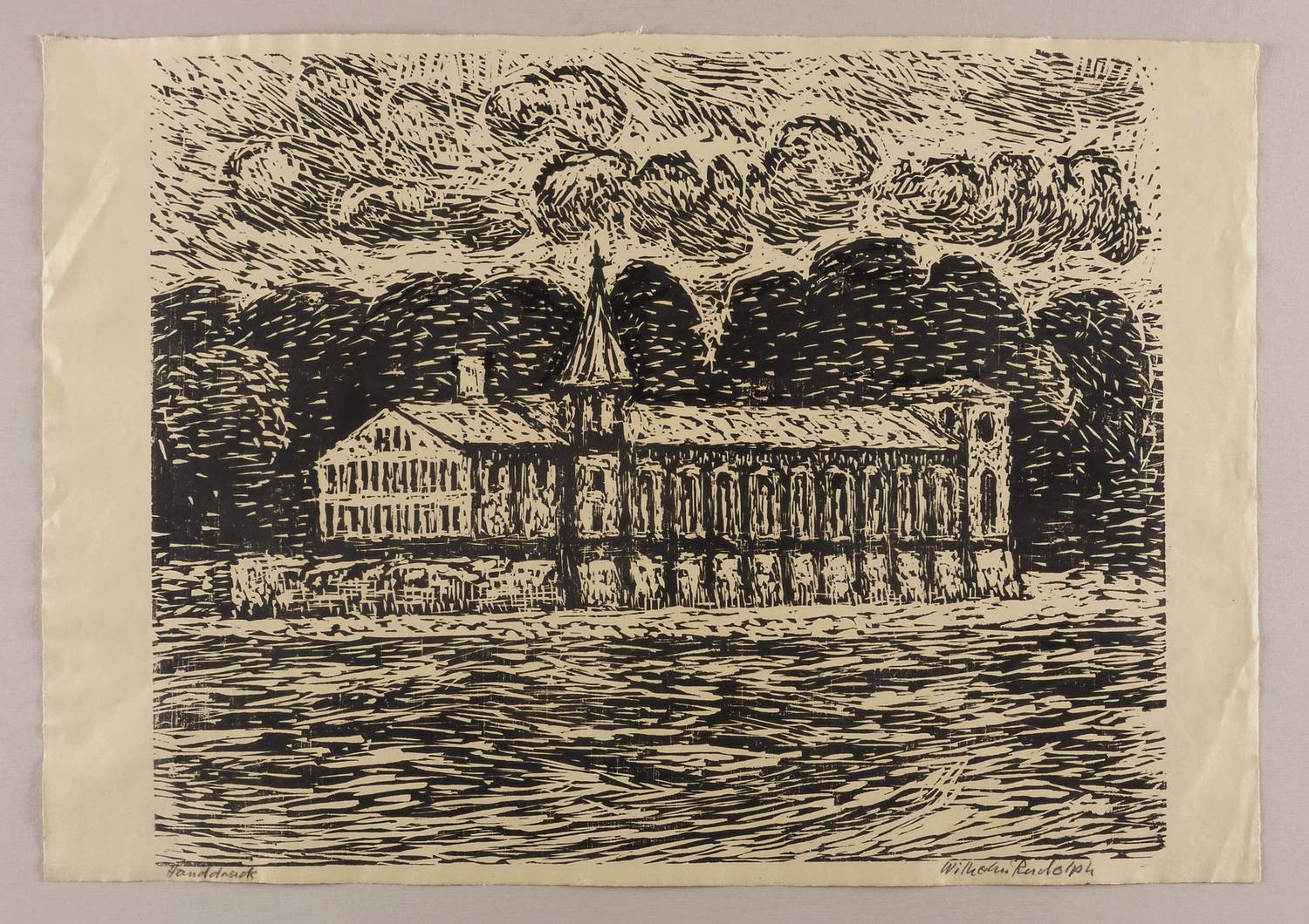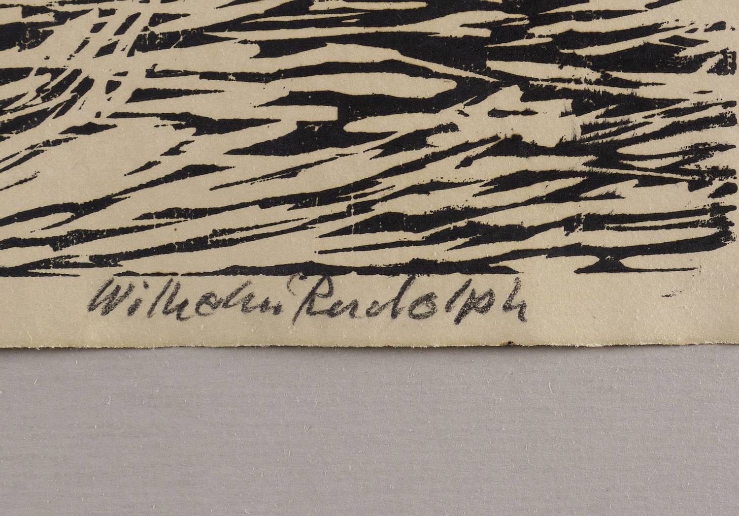 Rechts unten in Bleistift signiert: ″Wilhelm Rudolph″. Links bezeichnet: ″Handdruck″. – Eigenhändiger Abdruck bzw. Abrieb des Künstlers. – Leichte Altersspuren. Etwas griffspurig in den seitlichen Rändern. Insgesamt guter Zustand.