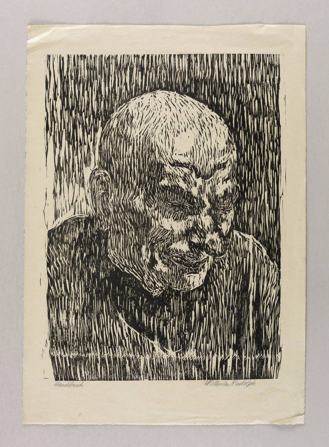 Rechts unten in Bleistift signiert: ″Wilhelm Rudolph″. Links bezeichnet: ″Handdruck″. – Eigenhändiger Abdruck bzw. Abrieb des Künstlers. - Ausstellung: 1988 Galerie Döbele Ravensburg (Kat.-Nr. 128, hier als ″Alter Mann″), 2014 Städtische Galerie Dresden (Kat.-Nr. 137, Abb. S. 125, hier unter dem Titel ″Porträt eines Mannes (Alter Lederarbeiter)″ ein offenbar nach 1945 weiter geschnittener Zustand mit fast weißem Hintergrund). – In den Blattecken teils bestoßen und eselsohrig. Guter Zustand.