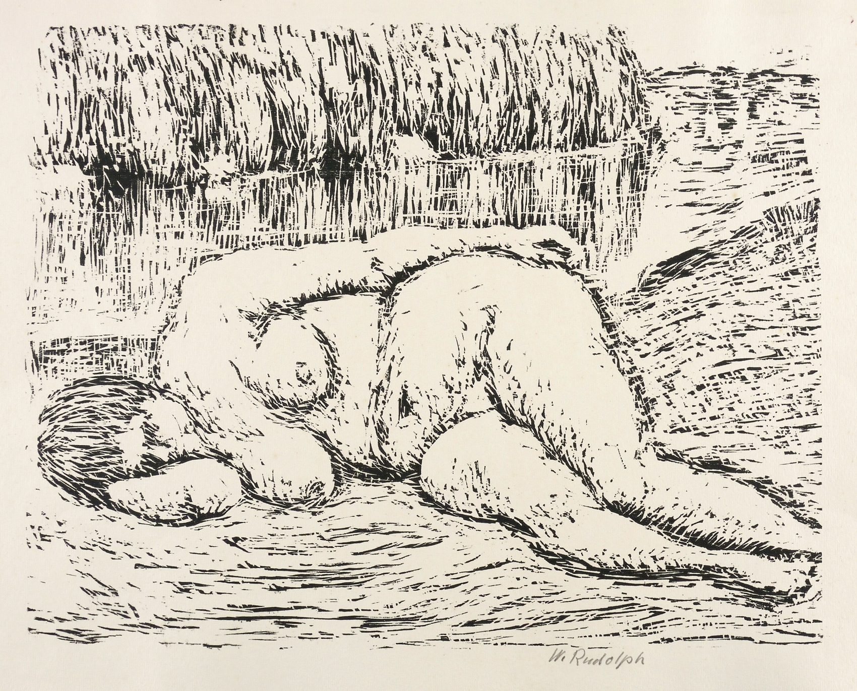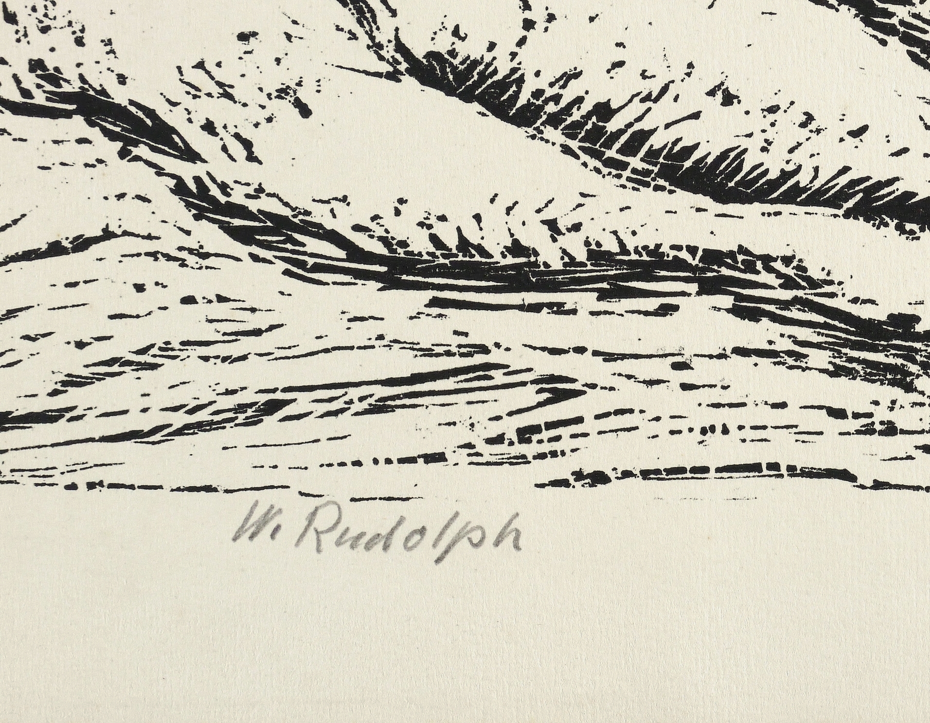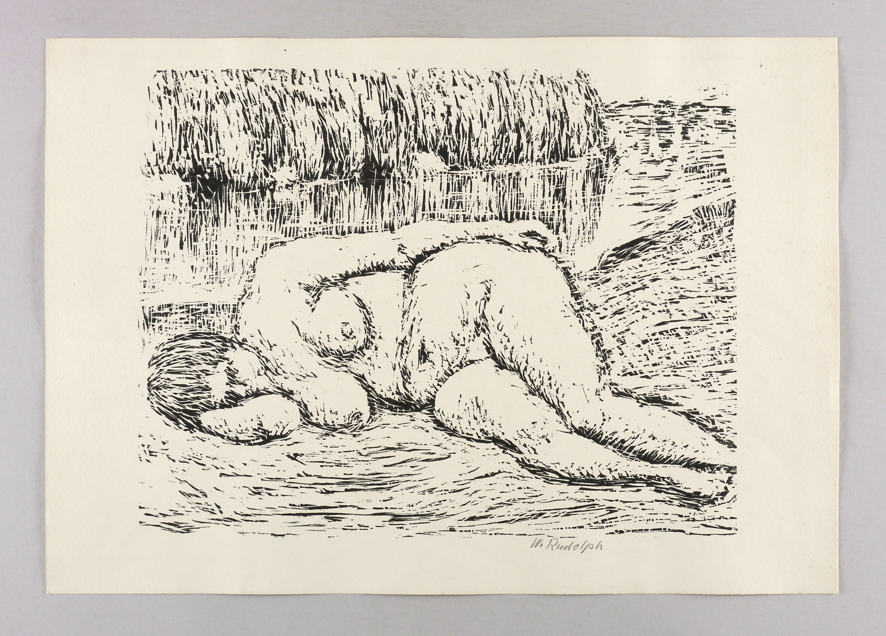 Rechts unten in Bleistift signiert: ″W. Rudolph″. – Auflagendruck im Umdruckverfahren nach dem etwas größerformatigen Holzschnitt von 1960-70. – Für die Lithografie siehe die Ausstellung: 2014 Städtische Galerie Dresden (Kat.-Nr. 152, Abb. S. 136, hier mit der falschen Technik-Bezeichnung: ″Holzschnitt″). – Für den Holzschnitt siehe: Martin Schmidt, Wilhelm Rudolph. Licht und Dunkelheit des Lebens und der Natur, Phantasos IV, Dresden: HfBK & Verlag der Kunst 2003, S. 150-151, Abb. 137; Wilhelm Rudolph Dresden DDR. Ölbilder, Aquarelle, Zeichnungen, Holzschnitte, Ausst.-Kat. Galerie Döbele Ravensburg 1982, Kat.-Nr. 252-254 (unter dem Titel ″Liegender Akt vor der Pillnitzer Insel I-III″); Wilhelm Rudolph 1889-1982. Aquarelle, Zeichnungen, Holzschnitte vor und nach 1945, Ausst.-Kat. Galerie Döbele Ravensburg 1988, Kat.-Nr. 135 (″Liegender weiblicher Akt vor Pillnitzer Insel″). – Papier im Rand altersbedingt unmerklich fleckig. Sonst tadellos. Guter Zustand.