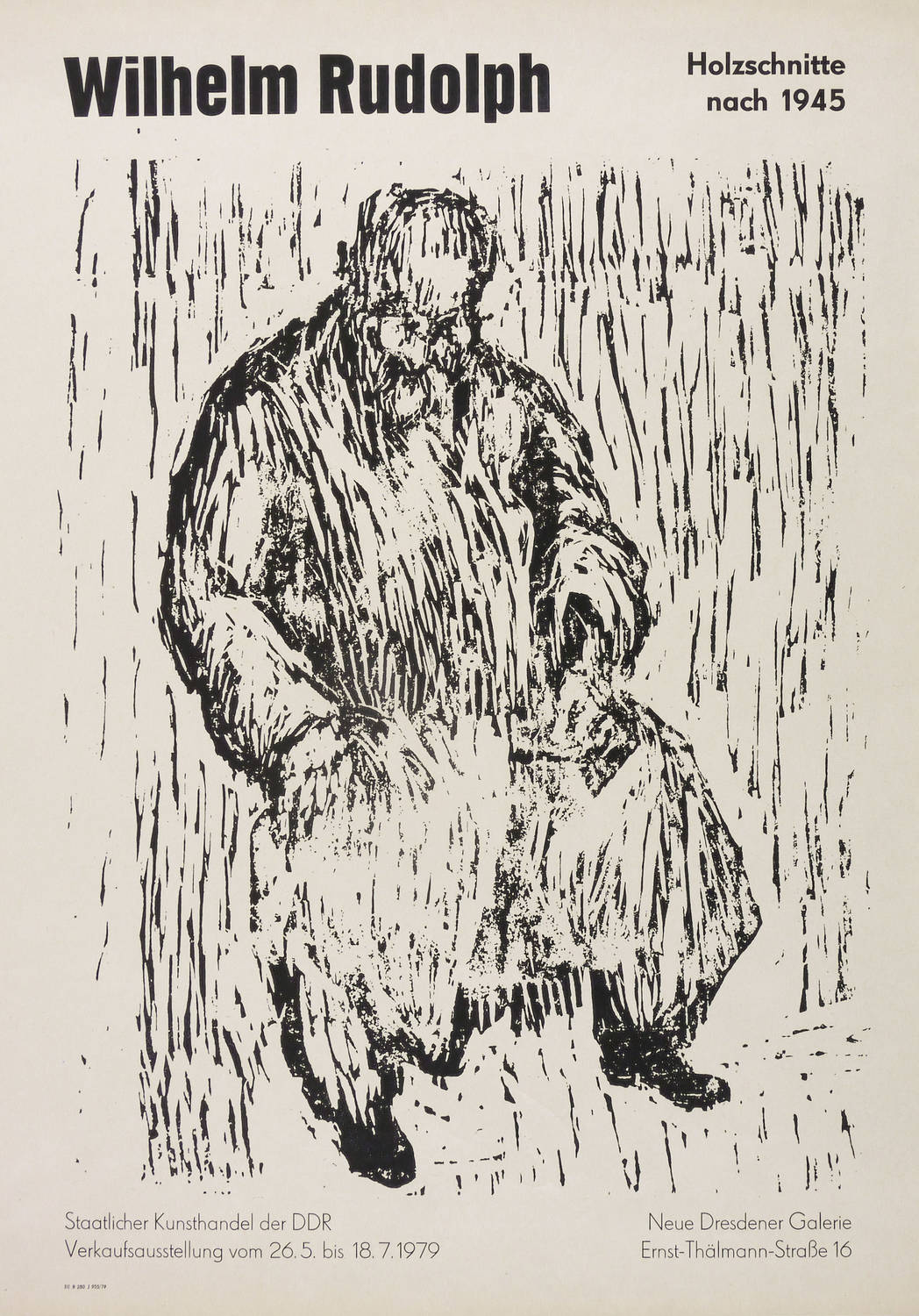 Nicht handsigniert. Diverse Plakat-Inschriften. – Künstlerplakat zur Ausstellung ″Wilhelm Rudolph Holzschnitte nach 1945″ in der Neuen Dresdener Galerie des Staatlichen Kunsthandels der DDR in Dresden 26.5.-18.7.1979. Mit der leicht verkleinerten Wiedergabe des Holzschnitts ″Sitzender Alter im Mantel″ von 1945-1950. – Provenienz: Sammlung Erhard Frommhold, Dresden. – Sehr guter Zustand.