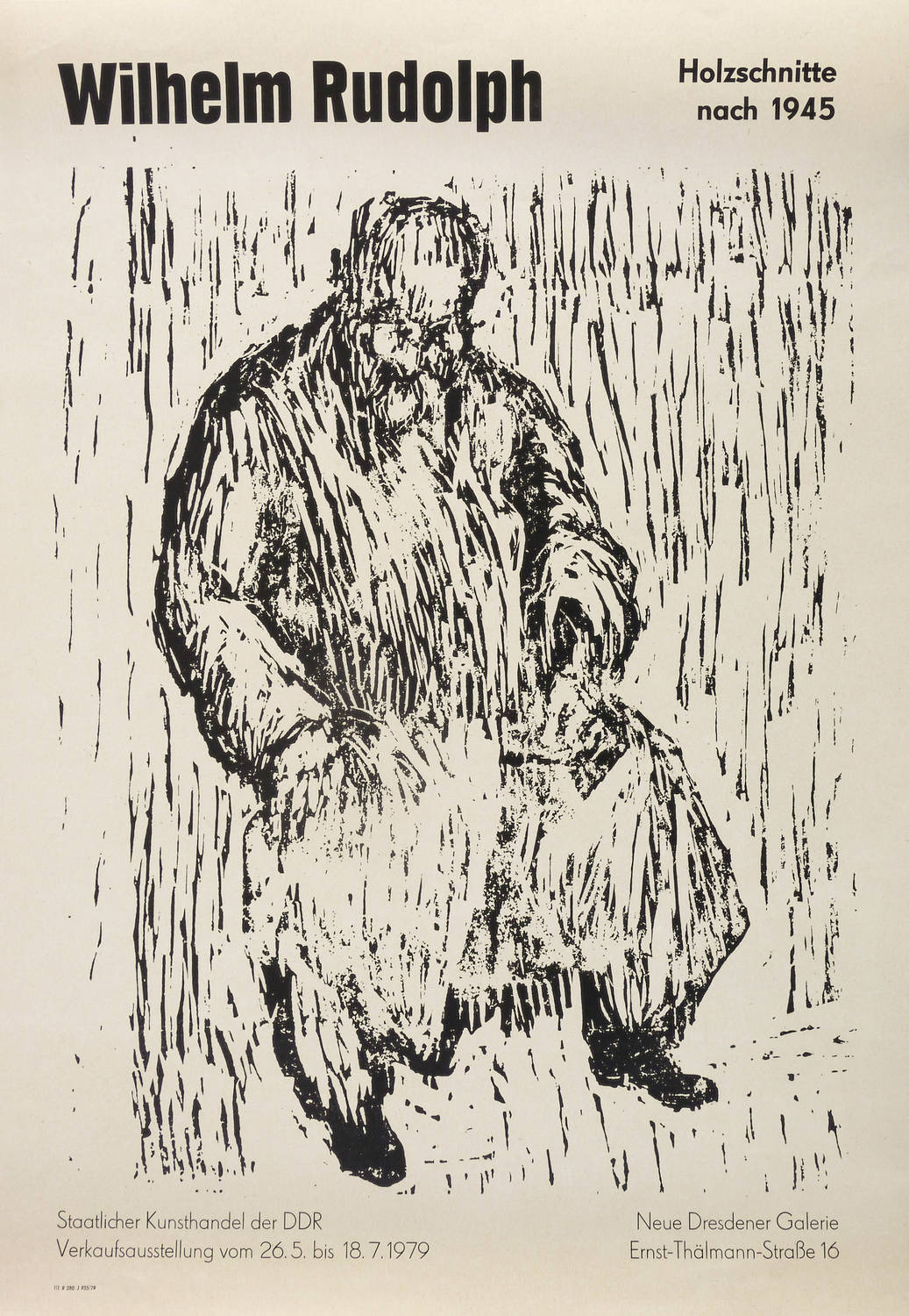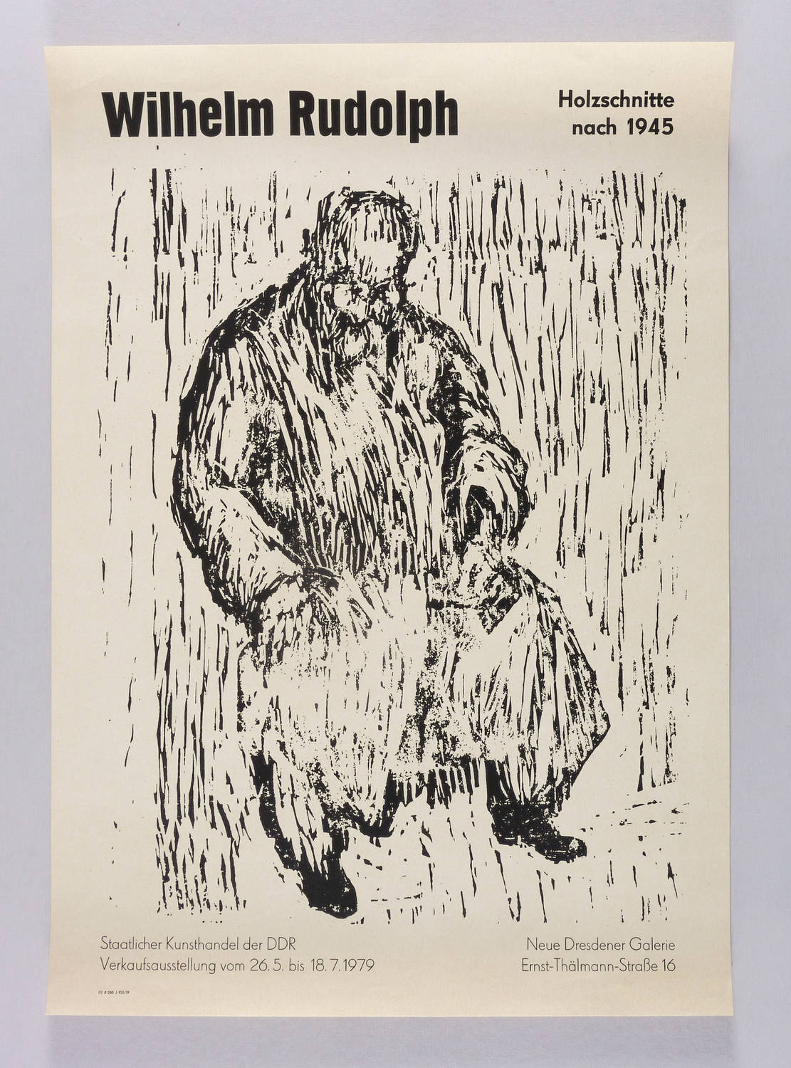 Nicht handsigniert. Diverse Plakat-Inschriften. – Künstlerplakat zur Ausstellung ″Wilhelm Rudolph Holzschnitte nach 1945″ in der Neuen Dresdener Galerie des Staatlichen Kunsthandels der DDR in Dresden 26.5.-18.7.1979. Mit der leicht verkleinerten Wiedergabe des Holzschnitts ″Sitzender Alter im Mantel″ von 1945-1950. – Provenienz: Sammlung Erhard Frommhold, Dresden. – Sehr guter Zustand.