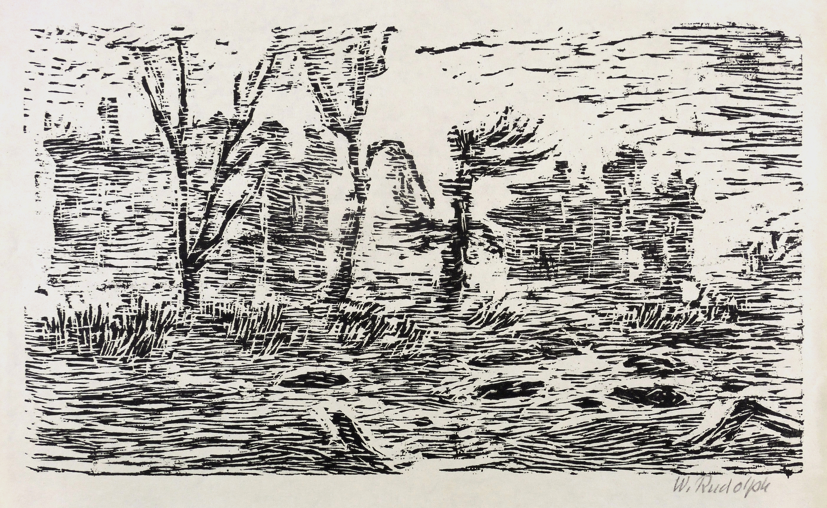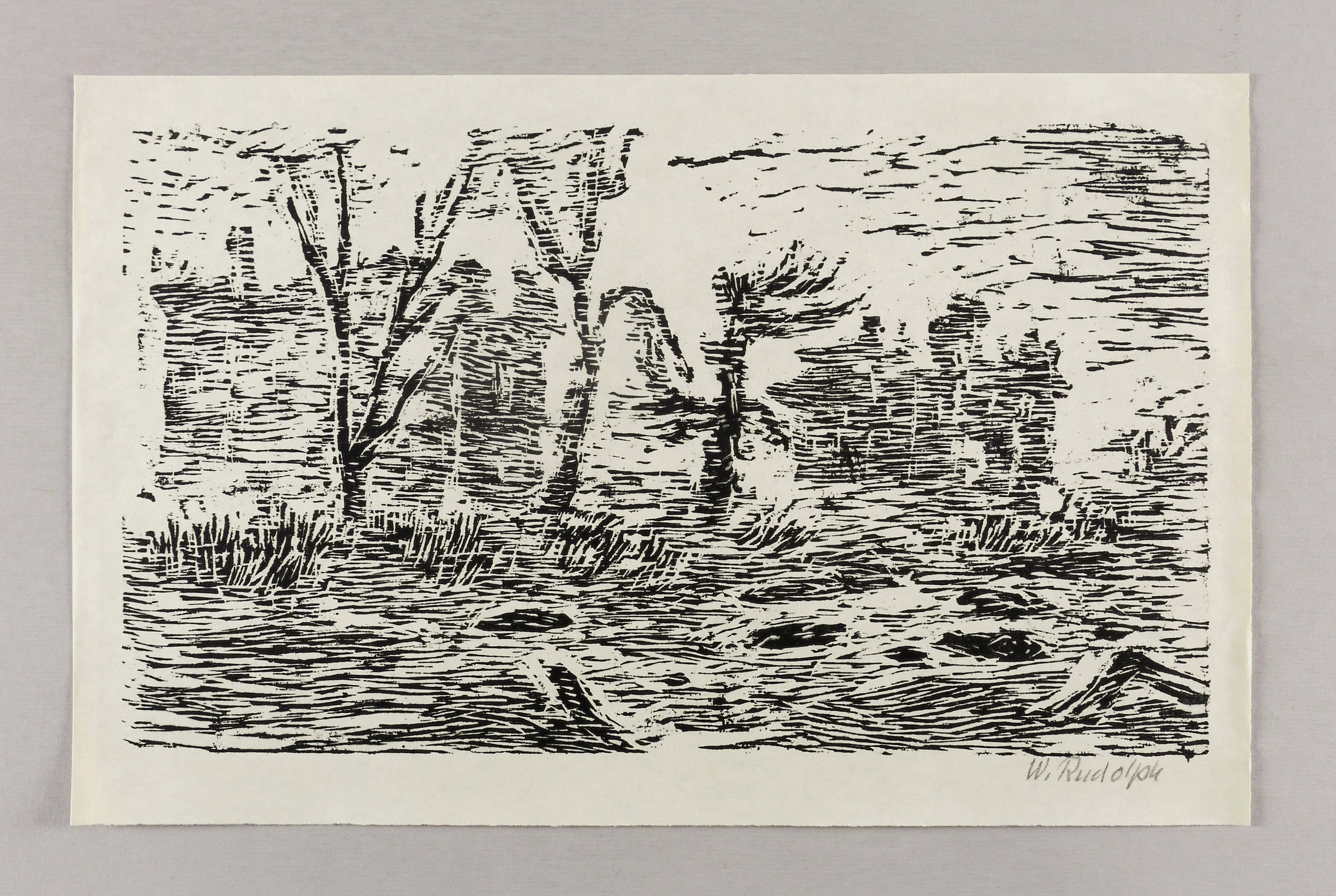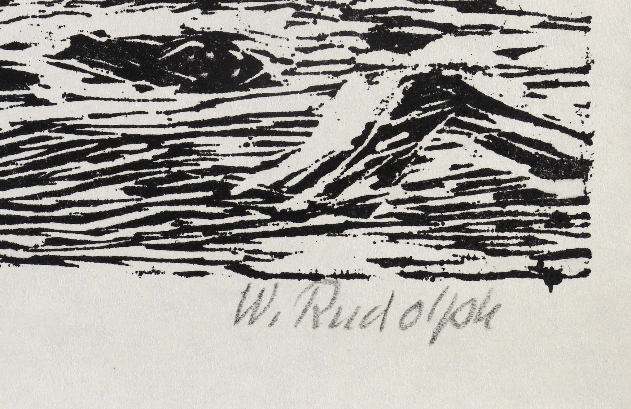 1946/1947. Holzschnitt, in Schwarz, auf leichtem gelblichem Velin. – Originale Künstlergrafik, von Wilhelm Rudolph. – 23,2 x 40,1 cm (Darstellung / Druckbild), 28 x 44 cm (Blatt).