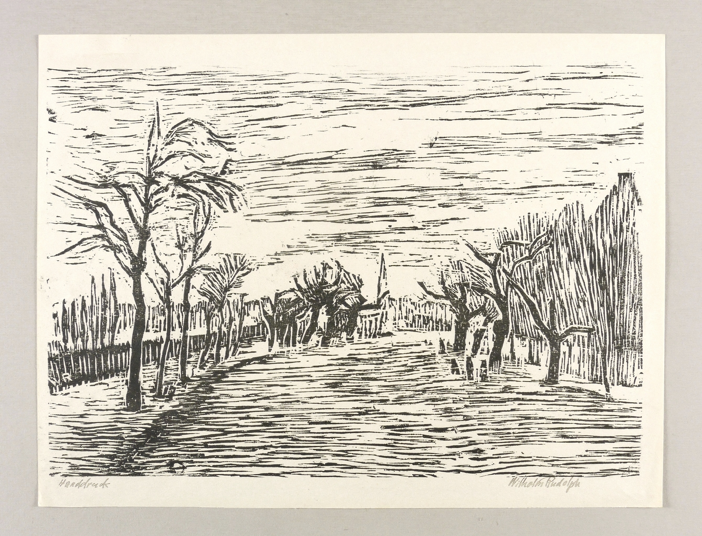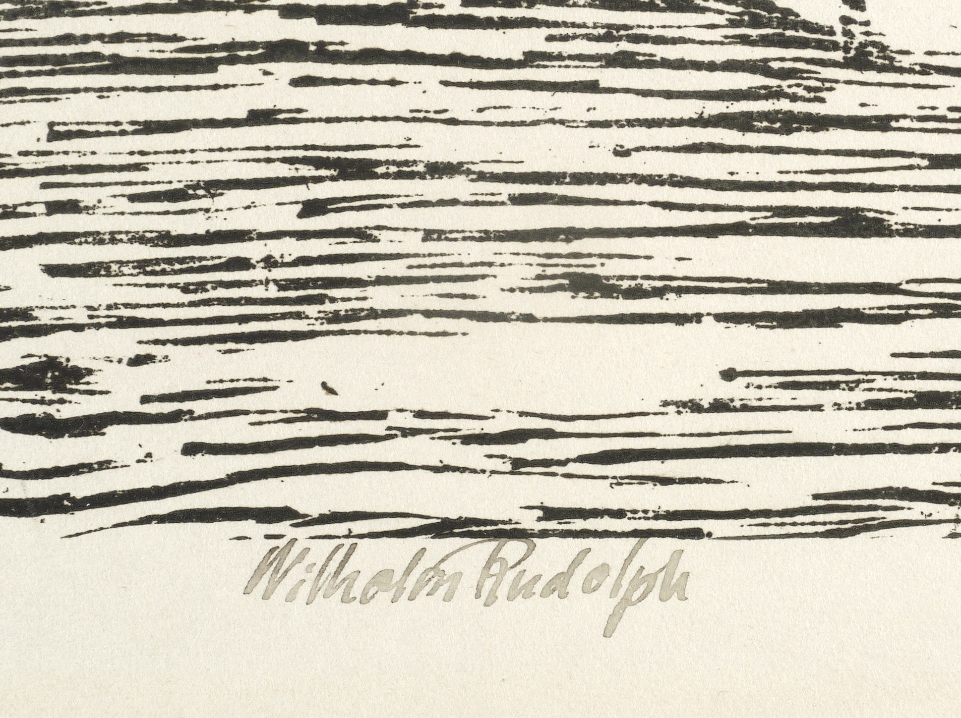 Rechts unten in Feder und grauer Tusche signiert: ″Wilhelm Rudolph″. Links bezeichnet: ″Handdruck″. Im Druckstock am linken Rand unten Monogramm: ″WR″. – Eine der letzten monogrammierten Arbeiten des Künstlers. – Zweiter Zustand des Holzschnitts (für den ersten Zustand vergleiche die Auktion vom 25.05.2024, Kunst- und Auktionshaus Quedlinburg). – Sehr guter Zustand.