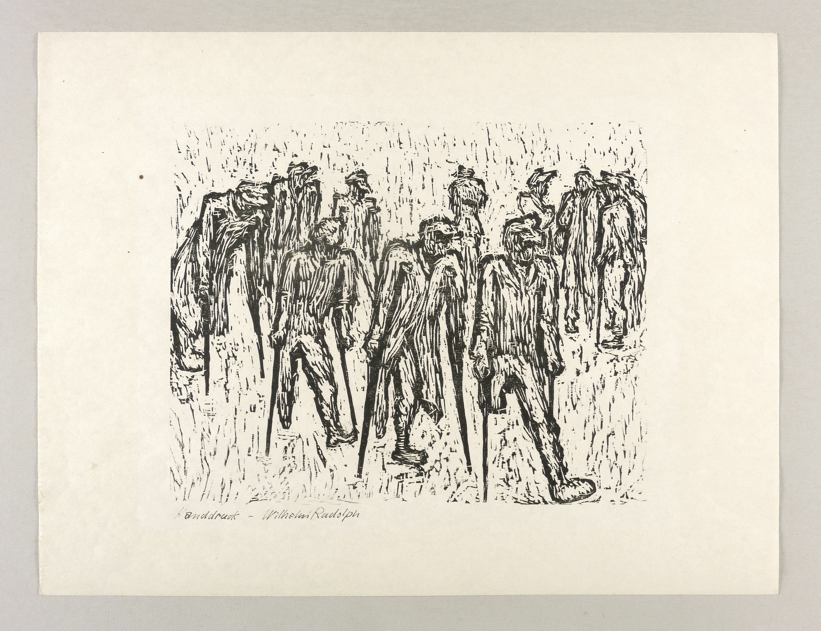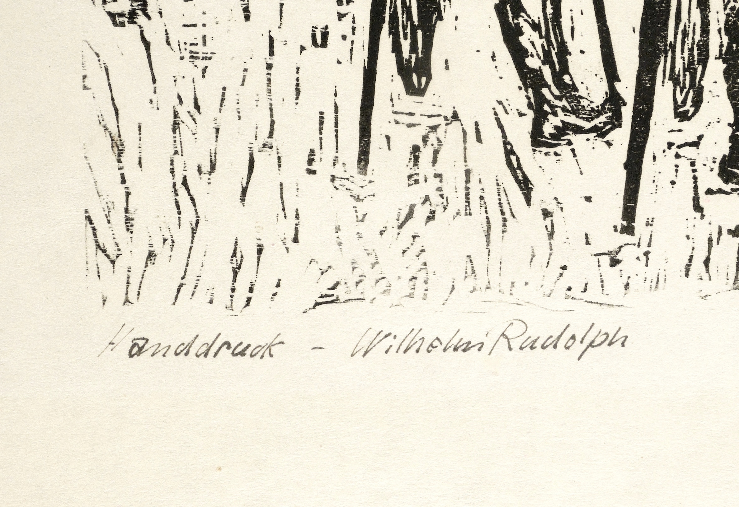 Links unten in schwarzer Feder signiert: ″Wilhelm Rudolph″. Daneben bezeichnet: ″Handdruck″. – Blatt Nr. 12 aus der 52 Holzschnitte umfassenden Mappe ″Aus″ von 1946-1948. – Ausstellung: 1974 Hochschule für Bildende Künste Dresden ″Dresden 1945. 55 Holzschnitte″ (Ausst.-Kat. Abb. ohne S.). 1982 Galerie Döbele Ravensburg (Kat.- Nr. 173, hier betitelt als ″Krüppel″). 2014 Städtische Galerie Dresden (Kat.-Nr. 119, Abb. S. 114, hier unter den Titeln ″Aus″ und ″Trümmer der Wehrmacht″). – Literatur: : W.R. Dresden als Erlebnis und moralische Landschaft. Holzschnitte, Aquarelle, Zeichnungen (Berlin: Haus am Lützowplatz 1981), Abb. S. 53; W.R. Dresden 45. Holzschnitte und Federzeichnungen (Leipzig: Reclam 1983), Abb. S. 64. – Im breiten Rand links neben der Darstellung Materialeinschluss im Papier. Kaum merkliche Lagerspuren. Sehr guter Zustand.