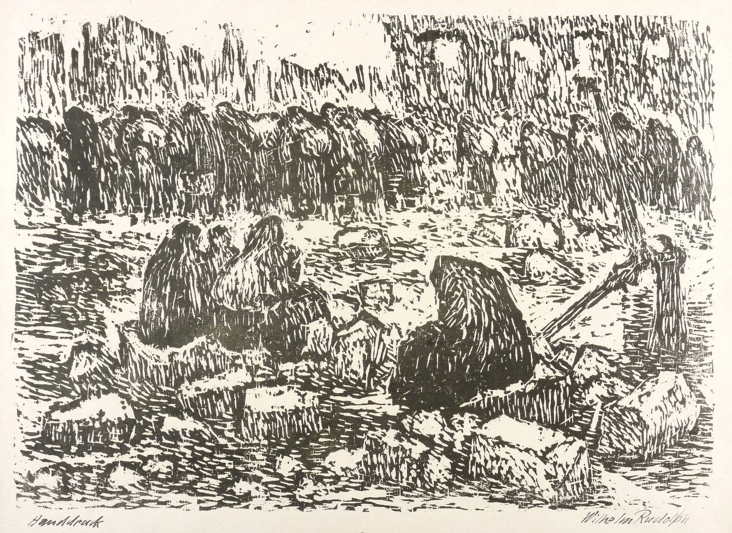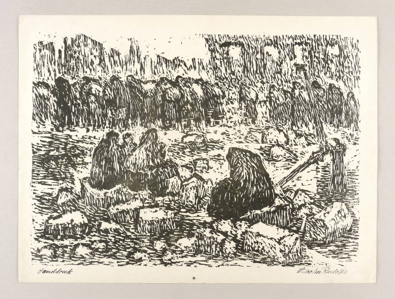 Rechts unten in schwarzer Feder signiert: ″Wilhelm Rudolph″. Links bezeichnet: ″Handdruck″. Rechts unten in Bleistift Blatt-Nr.: ″1″. – Blatt Nr. 1 aus der 52 Holzschnitte umfassenden Mappe ″Aus″ von 1946-1948. – Ausstellung: 1974 Hochschule für Bildende Künste Dresden ″Dresden 1945. 55 Holzschnitte″ (Ausst.-Kat. Abb. ohne S.). 1988 Galerie Döbele Ravensburg (Kat.- Nr. 84, Abb. S. 44). 2014 Städtische Galerie Dresden (Kat.-Nr. 119, Abb. S. 114). – Im unteren Rand Fleck von Druckfarbe aus dem Herstellungsprozess. Kaum merkliche Lagerspuren. Sehr guter Zustand.