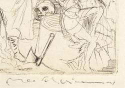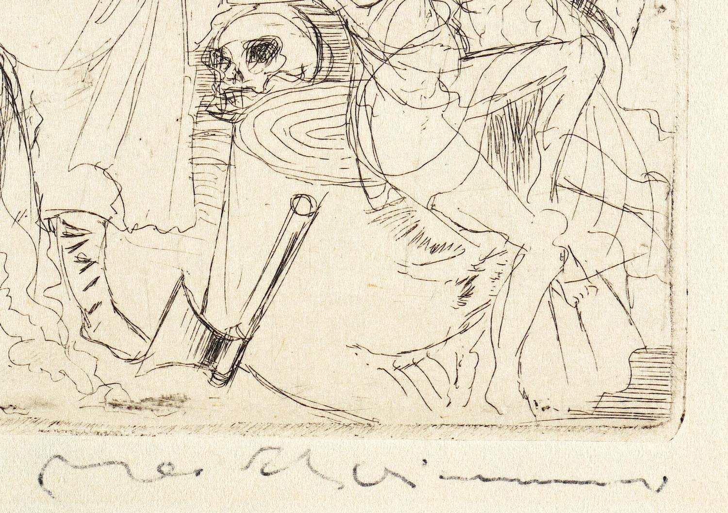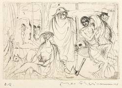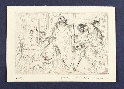 Max Schwimmer (1895 Leipzig - 1960 Leipzig). Deutscher Maler, Grafiker und Illustrator des expressiven Realismus. Ab 1919 Studium der Kunstgeschichte und Philosophie an der Universität Leipzig. Beginn der künstlerischen Tätigkeit u.a. für die Zeitschriften "Die Aktion" und "Der Drache". Studienreise nach Frankreich und Italien. 1926 Dozent an der Kunstgewerbeschule in Leipzig. 1933 aus dem Lehramt entlassen, neun Werke wurden als "entartete Kunst" diffamiert und konfisziert. Bis 1945 arbeitete er als Illustrator. 1944 als Soldat der Wehrmacht eingezogen und Ausbildung zu Wachmann eines Kriegsgefangenen-Lagers in Mühlberg an der Elbe. Im April 1945 Flucht der Wachmannschaft nach Altenburg in die amerikanische Besatzungszone. Nach Kriegsende Eintritt in die KPD. 1946 Berufung als Professor und Leiter der Abteilung Graphik an die Staatliche Akademie für Graphische Künste und Buchgewerbe in Leipzig. 1951 infolge einer Kampagne von seinem Dienst entbunden. Im selben Jahr Berufung an die Dresdner Hochschule für Bildende Künste (HfBK) als Leiter der Abteilung Grafik. Seit 1952 Mitglied der Akademie der Künste zu Berlin.