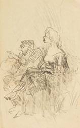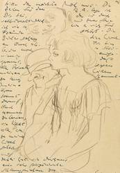 Nicht handsigniert. Umlaufend in blauer Feder Gruß des Künstlers. – Verso weitere Bleistiftzeichnung einer Dame im Abendkleid, neben einem Herrn auf einem Sofa sitzend. – Im Rand zwei kleine Einrisse. Links unten größeres Eselsohr. Mäßig guter Zustand.