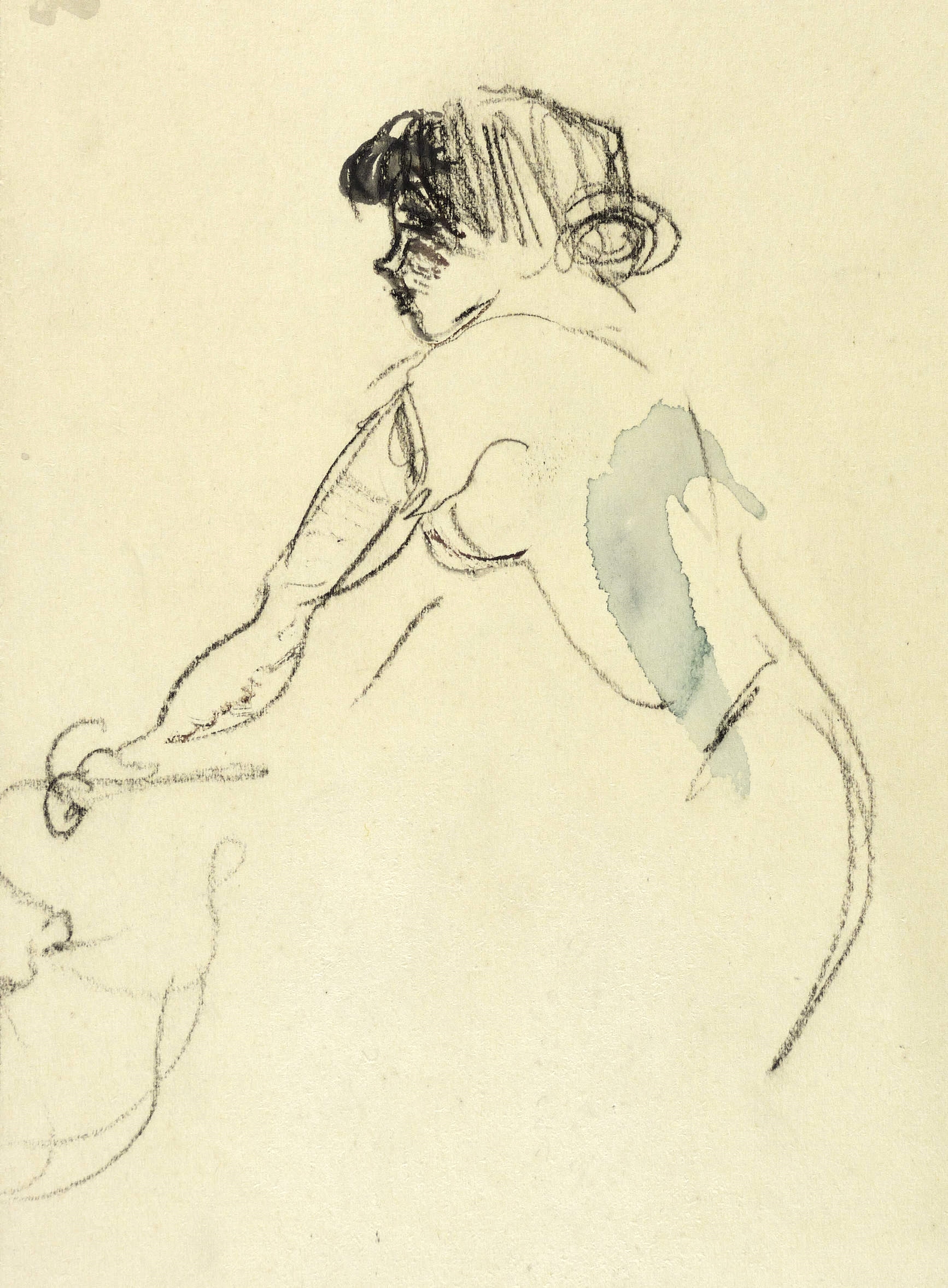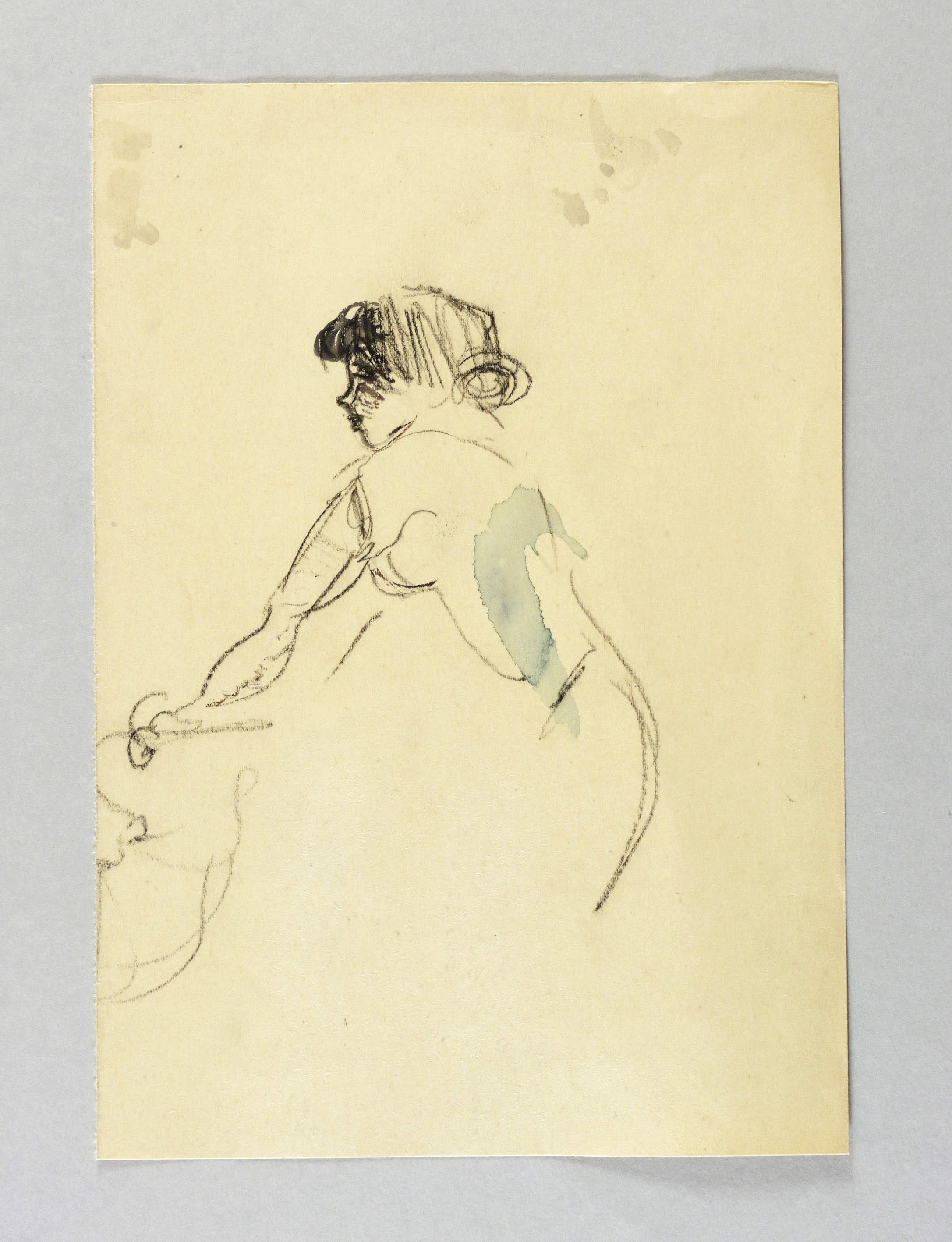 Nicht näher bezeichnet. – Verso weitere Skizzen in schwarzer Kreide mit einem Indianer sowie einem jungen Paar zu Tisch. - Provenienz: Nachlass Franz Schwimmer, Privatbesitz Leipzig. - Auf Wunsch mit Zertifikat. – Atelierspuren, Aquarellflecken aus dem Arbeitsprozess. Insgesamt eher mäßig guter Zustand.