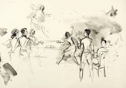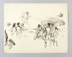 1950-1960. Zeichnung / Pinsel- & Federzeichnung, in schwarzer Tusche, laviert, auf hellem Karton. – Originale Künstlergrafik, von Max Schwimmer. – Unikat. – 18,8 x 28,6 cm (Darstellung), 25 x 32 cm (Blatt).