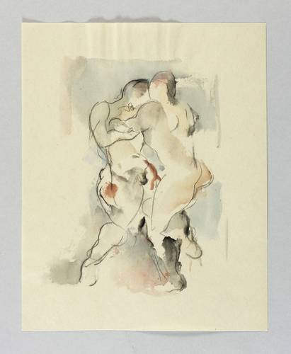 1950-1960. Aquarell, über schwarzer Kreide, auf gelbem Velin. – Originale Künstlergrafik, von Max Schwimmer. – Unikat. – 16,9 x 12,8 cm (Darstellung), 22,0 x 17,5 cm (Blatt).