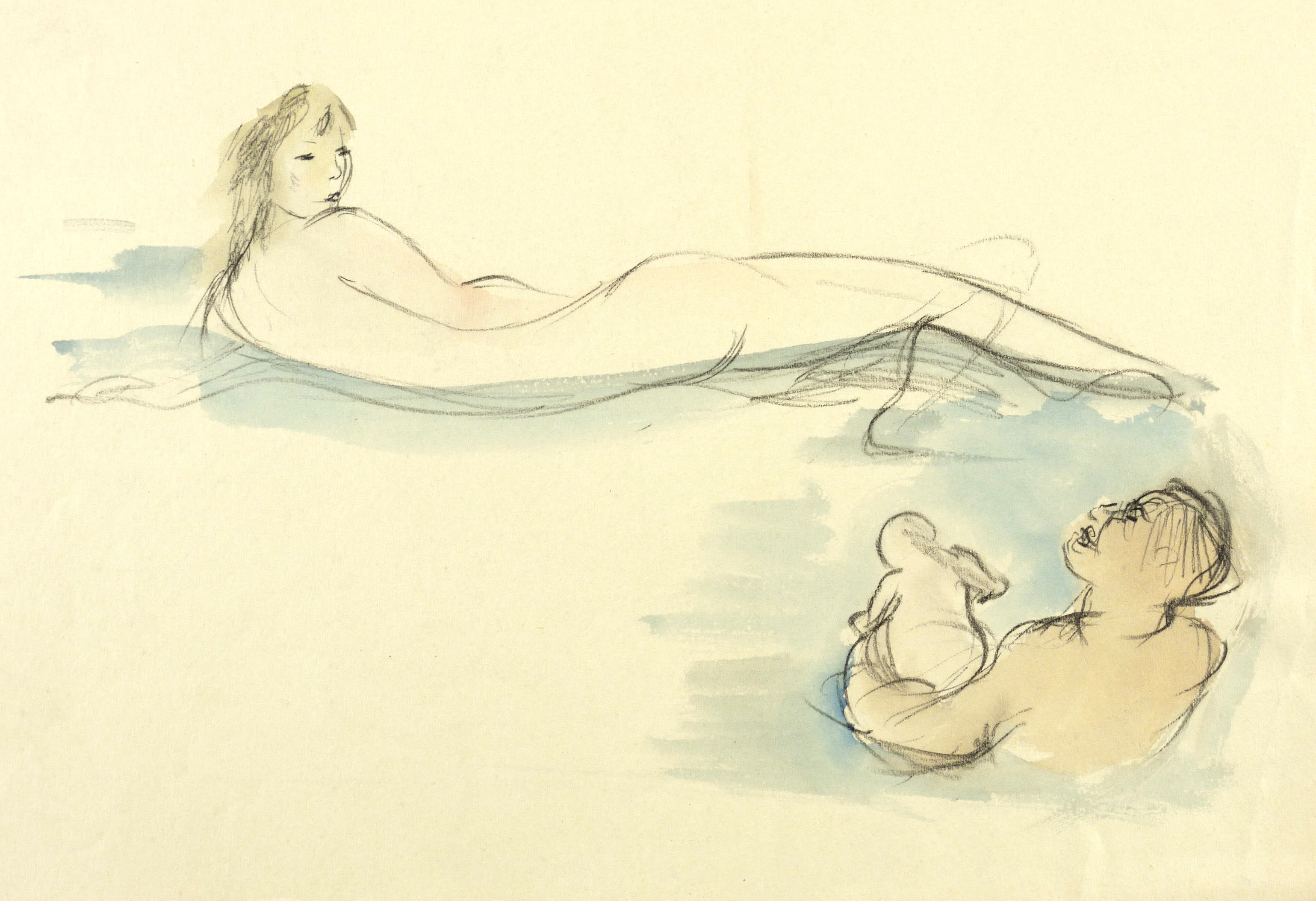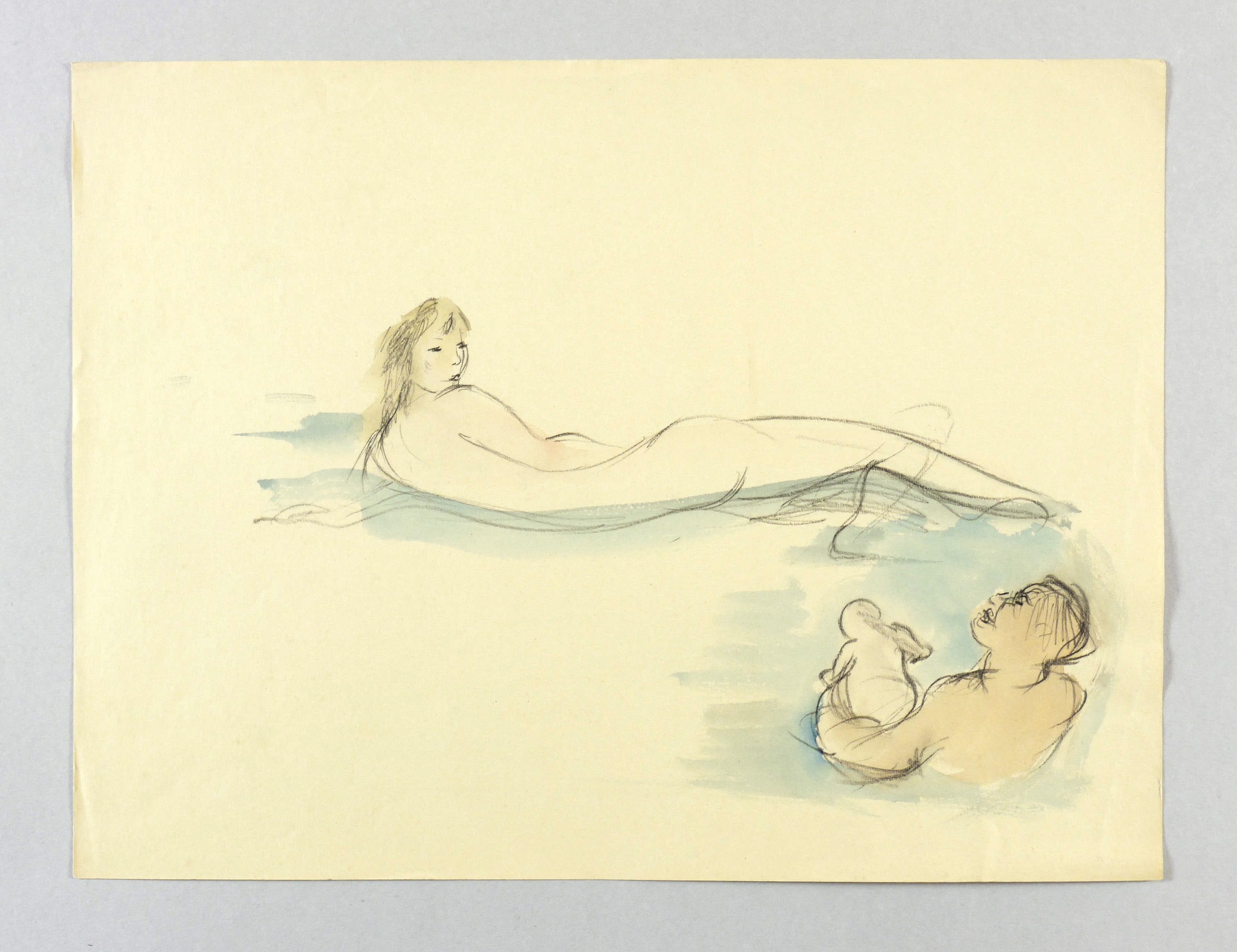 1935-1940. Zeichnung / Kreidezeichnung, aquarelliert, auf gelbem Maschinenpapier. – Originale Künstlergrafik, von Max Schwimmer. – Unikat. – 14,4 x 24,7 cm (Darstellung), 23 x 30,5 cm (Blatt).