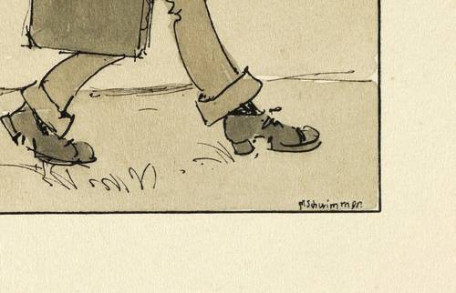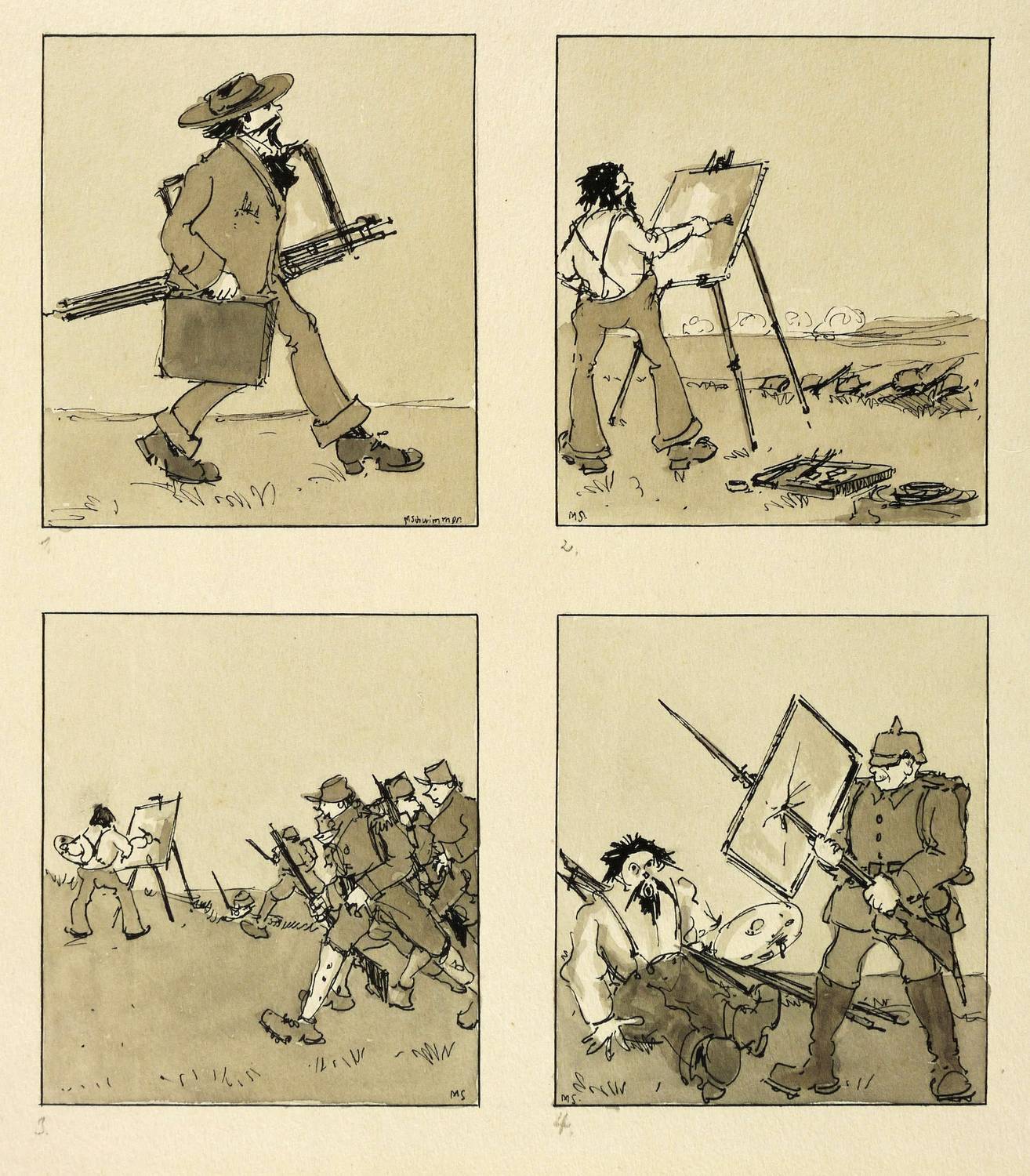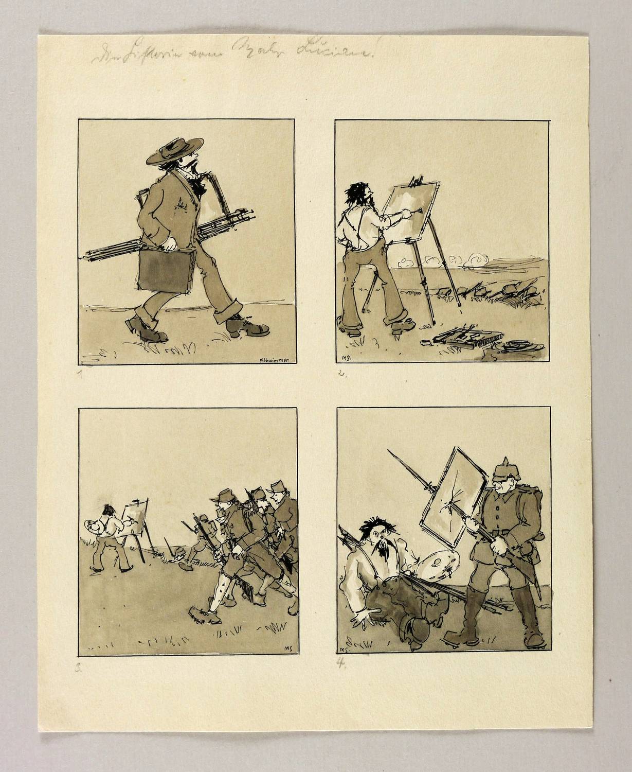 In den Darstellungen jeweils in schwarzer Feder signiert oder monogrammiert. Im oberen Blattrand eigenhändig in Bleistift bezeichnet: ″Die Historie vom Maler Lucian″. Die einzelnen Darstellungen jeweils links unterhalb in Bleistift nummeriert 1-4. – Frühwerk, entstanden zwischen Lehrerseminar und Studium an der Leipziger Universität. Vermutlich als Karikatur bzw. Illustration für eine der Zeitschriften gedacht, für die Schwimmer zu arbeiten begann: ″Die Aktion″ oder ″Der Drache″. - Für den frankophilen Schwimmer ist wohl bezeichnend, dass er die französischen Soldaten am Maler vorbeistürmen, einen deutschen Soldaten mit Pickelhaube jedoch die Leinwand mit dem Bajonett zerstechen lässt. – Sehr guter Zustand.