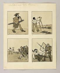 1916-1918. Zeichnung / Federzeichnung, in 4 Bildern, in schwarzer Tusche, auf festem gelbem Velin. – Originale Künstlergrafik, von Max Schwimmer. – Unikat. – 9,7 x 8,6 cm (Darstellungen), 28 x 22 cm (Blatt).
