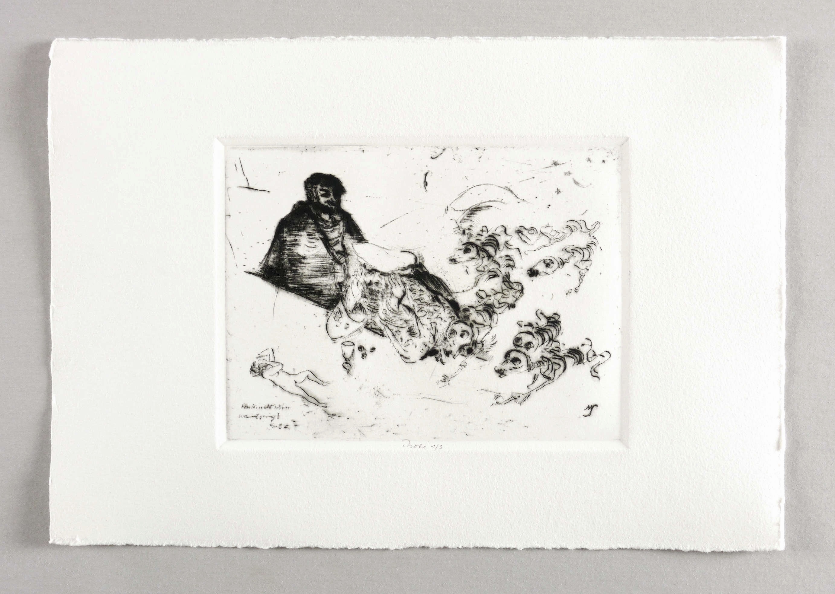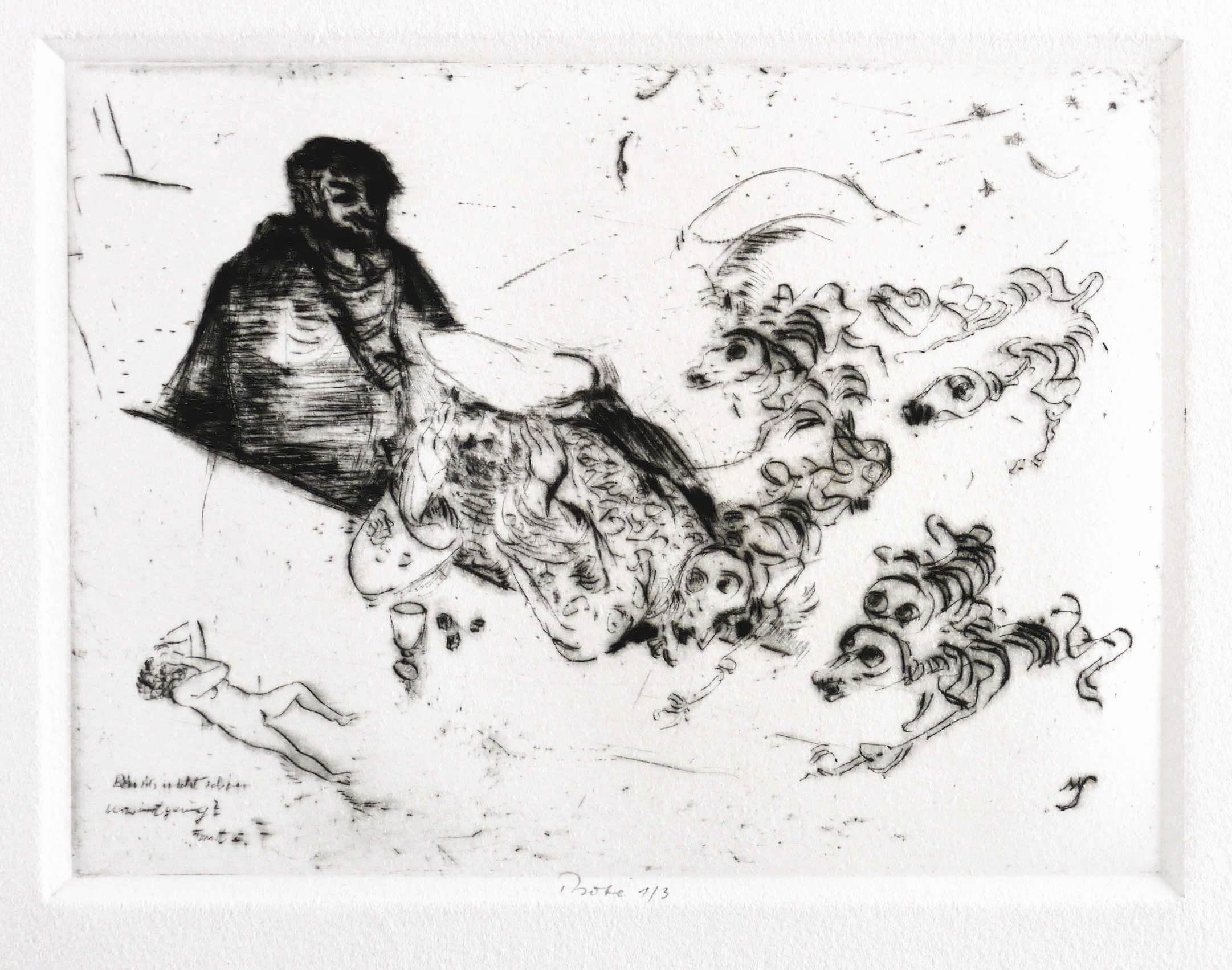 George 116. – Unterhalb im Plattenrand in Bleistift Auflagenbezeichnung: ″Probe 1/3″. In der Platte rechts unten ligiertes Monogramm: ″MS″. Links Inschrift: ″Bin ich nicht schon verwirrt genug? Faust II″. Verso in Bleistift signiert von der wissenschaftlichen Betreuerin des Nachlasses Magdalena George. – Posthumer Abzug von der originalen Platte. Nummerierter und autorisierter Probedruck. – Tadellos. Sehr guter Zustand.