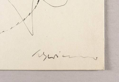 Um 1940. Zeichnung / Federzeichnung, in schwarzer Tusche, auf hellgelbem Velinkarton. – Originale Künstlergrafik, von Max Schwimmer. – Unikat. – 23,4 x 18,5 cm (Blatt), 18,2 x 16,5 cm (Darstellung).